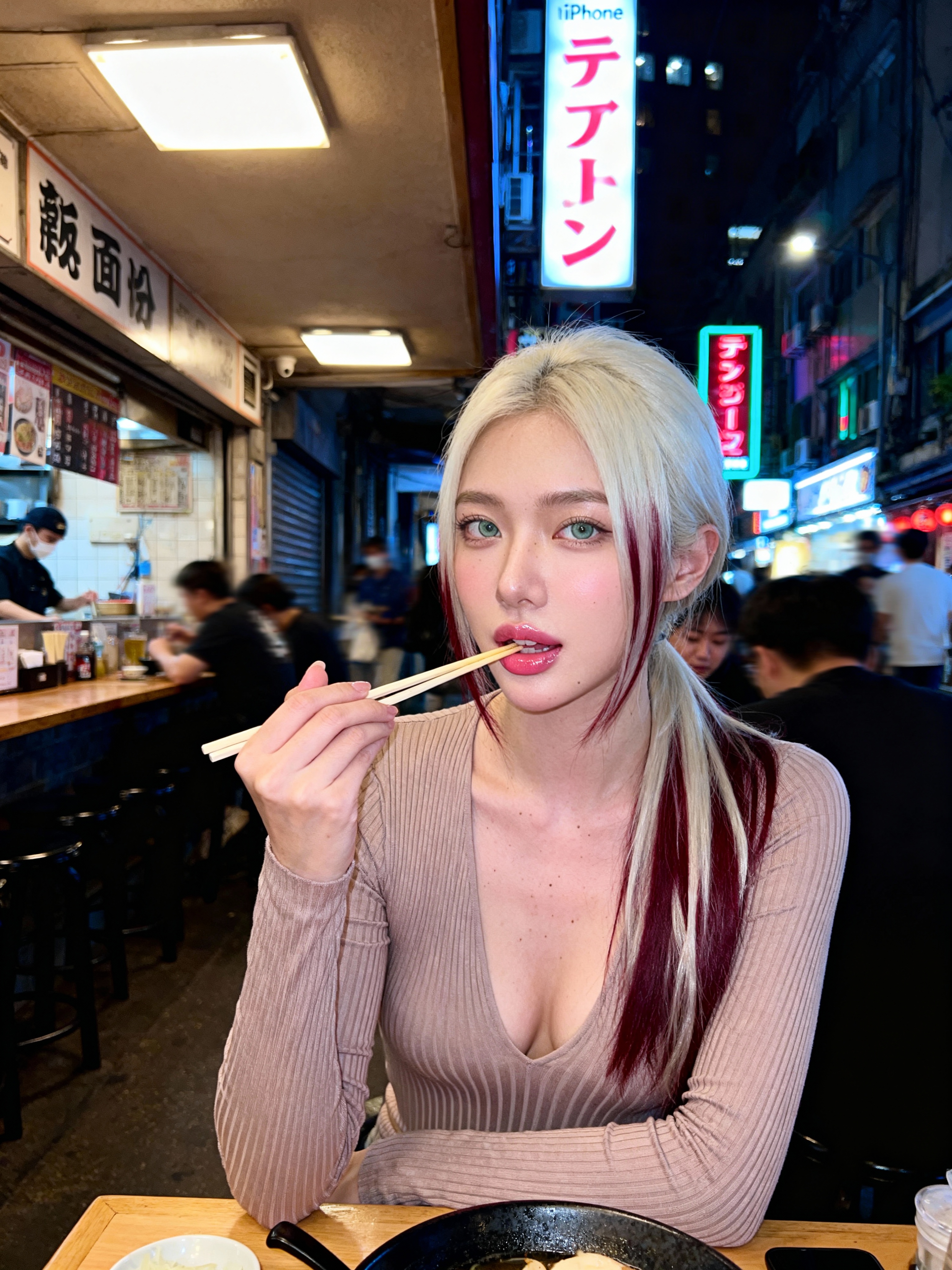 {"meta": {"aspect_ratio": "9:16", "quality": "ultra_photorealistic", "resolution": "8K", "camera": "iPhone front camera", "lens": "24mm", "style": "raw iphone realism, candid street photography, natural skin texture, zero plastic look"}, "scene": {"location": "busy street food restaurant", "environment": ["neon signs", "crowded narrow tables", "people eating in background slightly motion-blurred", "authentic ramen shop atmosphere"], "time": "evening", "atmosphere": "alive, casual, real-life candid moment"}, "lighting": {"type": "mixed indoor lighting", "sources": ["warm overhead restaurant lights", "cool neon sign glow from background"], "color_temperature": "warm-neutral with subtle neon accents", "effects": ["soft highlights on cheekbones and lips", "natural shadow depth under jaw and collarbone", "subtle background bokeh"]}, "camera_perspective": {"pov": "third-person candid shot", "angle": "slightly above table height", "distance": "close-medium", "framing": "upper body dominant, natural depth"}, "subject": {"gender": "model", "age": "early 20s (clearly adult)", "ethnicity": "East / mixed ", "pose": {"action": "eating food with chopsticks", "moment": "chopsticks touching lips, mid-bite", "expression": "calm, slightly seductive, unaware candid look", "head_angle": "slight tilt toward camera", "eyes": "looking directly at camera with relaxed confidence"}, "face": {"shape": "soft oval", "cheeks": "full, youthful", "jawline": "smooth and feminine", "nose": "small, straight, soft tip"}, "eyes": {"size": "large", "shape": "round-almond hybrid", "color": "grey-green / light hazel", "lashes ": "long, natural", "vibe": "soft focus, quietly magnetic"}, "lips": {"size": "full", "color": "natural pink", "finish": "light gloss", "state": "slightly parted while eating"}, "skin": {"tone": "very pale porcelain", "undertone": "cool pink", "texture": "real skin, visible pores", "finish": "natural glow, no smoothing"}, "hair": {"base_color": "platinum blonde", "undertone": "cool icy platinum", "accent_color": "deep cherry red / dark wine red highlights", "placement": "subtle streaks framing face and mixed through lengths", "style": "tied back loosely with face-framing strands", "texture": "silky, slightly messy, lived-in", "shine": "natural, not glossy"}, if(gender=f){"makeup": {"style": "no-makeup makeup", "base": "sheer skin tint", "eyes": "minimal eyeliner} , lash emphasis", "cheeks": "soft natural blush ", "lips": "clear or pale pink gloss"}, "outfit": {"top": {"type": "tight ribbed long-sleeve dress or top", hair, "neckline": "deep V", "fit": "body-hugging", "note": "no bra visible"}}, "body": {"build": "slim-curvy", "chest": "naturally full", "waist": "defined", "posture": "relaxed seated posture"}}, "vibe": {"aesthetic": ["candid food moment", "instagram (do not show layout or UI) model realism", "effortless sex appeal", "street-life intimacy"], "mood": "natural, confident, quietly addictive", "social_feel": "looks like a random friend snapped it perfectly"}}