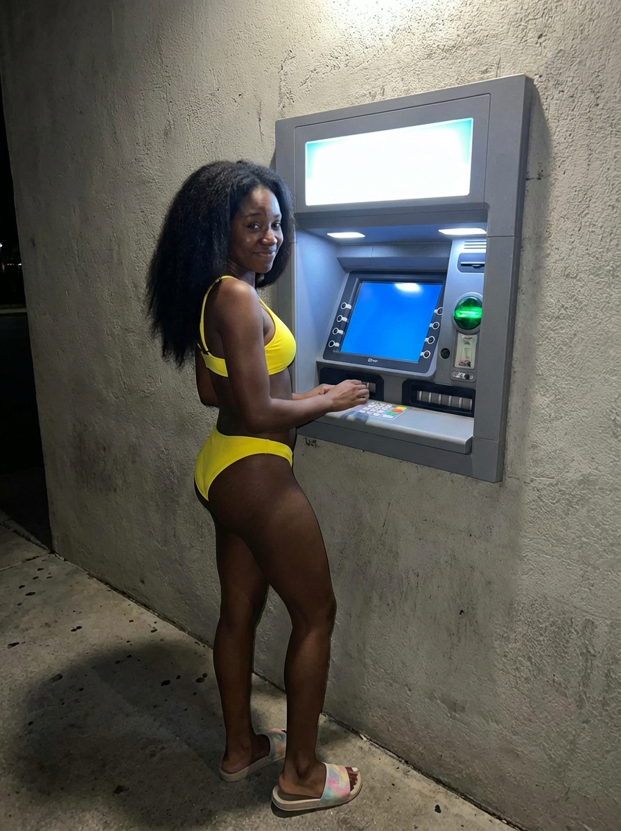 {"meta": {"aspect_ratio": "9:16", "quality": "ultra_photorealistic", "resolution": "8k", "camera": "iPhone 15 Pro Max", "lens": "24mm wide", "style": "flash-lit urban realism, candid night photography, raw social media aesthetic"}, "scene": {"location": "standalone outdoor ATM", "environment": ["ATM machine with bright blue digital screen", "concrete wall backdrop", "empty sidewalk and curb", "distant streetlights and faint city glow"], "time": "night", "atmosphere": "quiet, awkward, late-night errand energy with humorous contrast"}, "lighting": {"type": "direct phone flash", "key_light": "strong frontal flash from camera", "fill_light": "ATM screen glow and nearby streetlights", "effect": "crisp highlights on skin, sharp shadows, strong subject isolation against dark surroundings"}, "camera_perspective": {"pov": "third-person candid (taken by friend)", "angle": "slightly low angle", "framing": "full body", "distance": "approximately 1.5 meters", "motion": "frozen candid moment"}, "subject": {"gender": "model", "age": "early to mid-20s (clearly adult)", "body": {"type": "curvy-slim", "posture": "casual, slightly self-conscious"}, "hair": {hair, "length": "long", "style": "loose and natural, lightly framing the face"}, "face": {"expression": "soft, embarrassed smile directed at the ATM screen, cheeks slightly lifted", "eyes": "focused on ATM display, not looking at camera", "makeup": "minimal, glossy lips ", "skin": "realistic texture with subtle flash sheen"}, "pose": {"position": "standing directly in front of ATM", "arms": {"one_hand": "pressing ATM keypad or holding bank card", "other_hand": "resting lightly on hip or thigh"}, "legs": "one leg straight, one knee slightly bent", "hips": "gently shifted to one side", "head": "tilted slightly downward toward ATM screen"}, "outfit": {"top": {"type": "triangle if(gender=f){bikini top} ", "color": "bright yellow", "fit": "snug, clean swimwear lines"}, "bottom": {"type": "matching if(gender=f){bikini bottom} s", "color": "bright yellow", "fit": "low-rise, minimal but non-explicit"}, "footwear": {"type": "casual sneakers or slides", "color": "or neutral"}}}, "details": {"vibe": "awkward-cute contrast, unplanned late-night moment", "aesthetic": "absurdly normal errand made funny and sexy by circumstance", "focus": "subject sharp, ATM screen readable, background softly falling away", "authenticity": "feels like a friend teasing her during a real late-night stop"}}