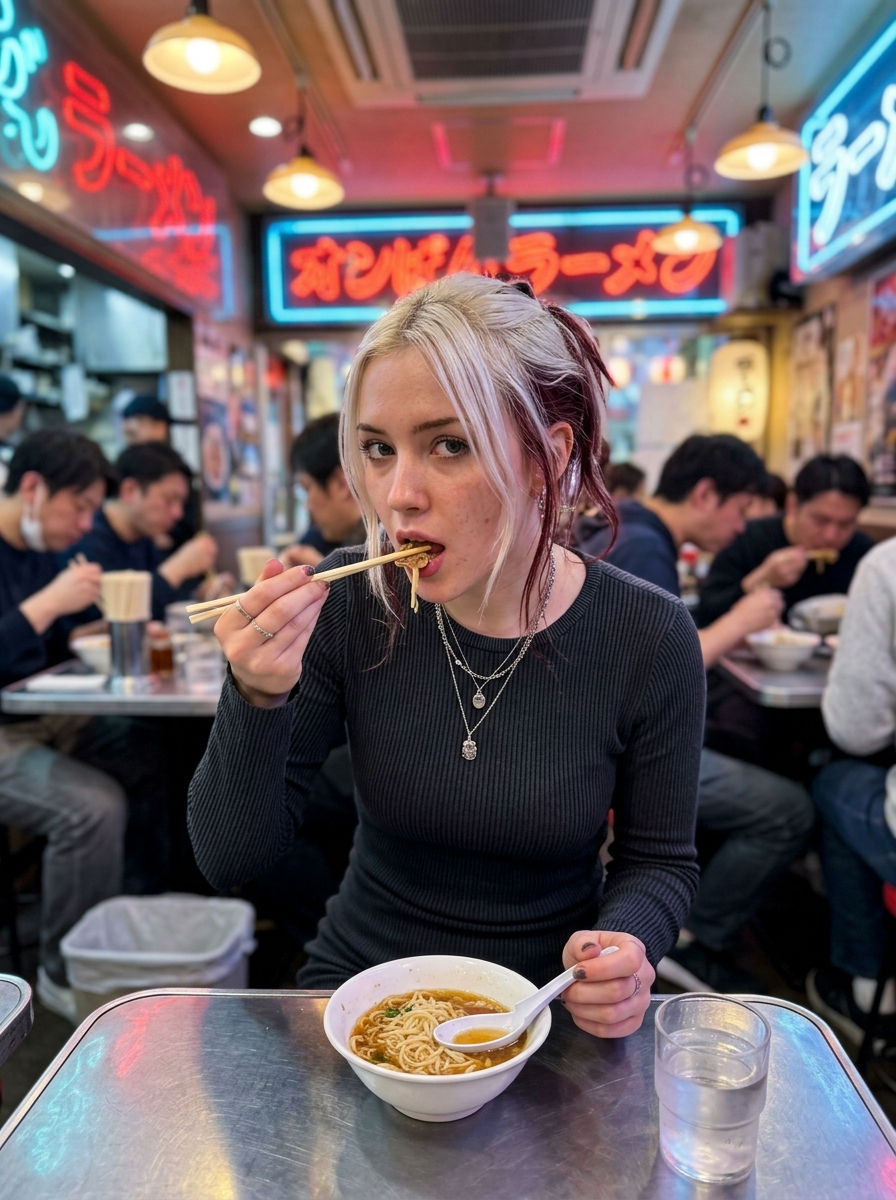 {"meta": {"aspect_ratio": "9:16", "quality": "ultra_photorealistic", "resolution": "8K", "camera": "iPhone front camera", "lens": "24mm", "style": "raw iphone realism, candid street photography, natural skin texture, zero plastic look"}, "scene": {"location": "busy street food restaurant", "environment": ["neon signs", "crowded narrow tables", "people eating in background slightly motion-blurred", "authentic ramen shop atmosphere"], "time": "evening", "atmosphere": "alive, casual, real-life candid moment"}, "lighting": {"type": "mixed indoor lighting", "sources": ["warm overhead restaurant lights", "cool neon sign glow from background"], "color_temperature": "warm-neutral with subtle neon accents", "effects": ["soft highlights on cheekbones and lips", "natural shadow depth under jaw and collarbone", "subtle background bokeh"]}, "camera_perspective": {"pov": "third-person candid shot", "angle": "slightly above table height", "distance": "close-medium", "framing": "upper body dominant, natural depth"}, "subject": {"gender": "model", "age": "early 20s (clearly adult)", "ethnicity": "East / mixed ", "pose": {"action": "eating food with chopsticks", "moment": "chopsticks touching lips, mid-bite", "expression": "calm, slightly seductive, unaware candid look", "head_angle": "slight tilt toward camera", "eyes": "looking directly at camera with relaxed confidence"}, "face": {"shape": "soft oval", "cheeks": "full, youthful", "jawline": "smooth and feminine", "nose": "small, straight, soft tip"}, "eyes": {"size": "large", "shape": "round-almond hybrid", "color": "grey-green / light hazel", "lashes ": "long, natural", "vibe": "soft focus, quietly magnetic"}, "lips": {"size": "full", "color": "natural pink", "finish": "light gloss", "state": "slightly parted while eating"}, "skin": {"tone": "very pale porcelain", "undertone": "cool pink", "texture": "real skin, visible pores", "finish": "natural glow, no smoothing"}, "hair": {"base_color": "platinum blonde", "undertone": "cool icy platinum", "accent_color": "deep cherry red / dark wine red highlights", "placement": "subtle streaks framing face and mixed through lengths", "style": "tied back loosely with face-framing strands", "texture": "silky, slightly messy, lived-in", "shine": "natural, not glossy"}, if(gender=f){"makeup": {"style": "no-makeup makeup", "base": "sheer skin tint", "eyes": "minimal eyeliner} , lash emphasis", "cheeks": "soft natural blush ", "lips": "clear or pale pink gloss"}, "outfit": {"top": {"type": "tight ribbed long-sleeve dress or top", hair, "neckline": "deep V", "fit": "body-hugging", "note": "no bra visible"}}, "body": {"build": "slim-curvy", "chest": "naturally full", "waist": "defined", "posture": "relaxed seated posture"}}, "vibe": {"aesthetic": ["candid food moment", "instagram (do not show layout or UI) model realism", "effortless sex appeal", "street-life intimacy"], "mood": "natural, confident, quietly addictive", "social_feel": "looks like a random friend snapped it perfectly"}}