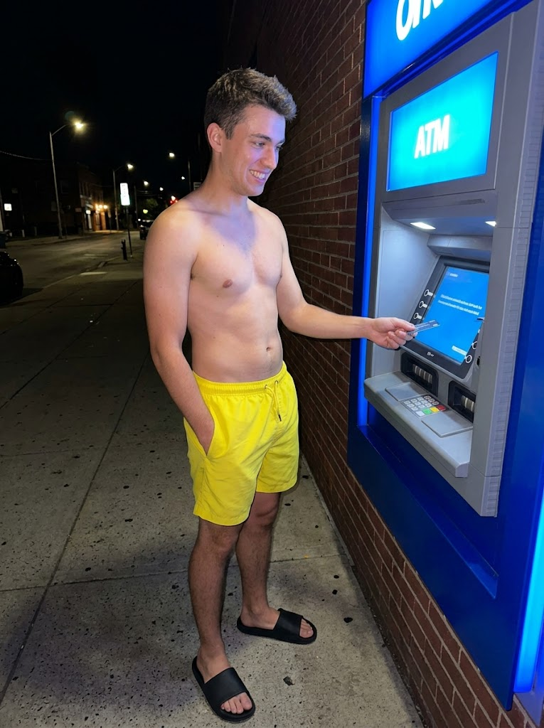 {"meta": {"aspect_ratio": "9:16", "quality": "ultra_photorealistic", "resolution": "8k", "camera": "iPhone 15 Pro Max", "lens": "24mm wide", "style": "flash-lit urban realism, candid night photography, raw social media aesthetic"}, "scene": {"location": "standalone outdoor ATM", "environment": ["ATM machine with bright blue digital screen", "concrete wall backdrop", "empty sidewalk and curb", "distant streetlights and faint city glow"], "time": "night", "atmosphere": "quiet, awkward, late-night errand energy with humorous contrast"}, "lighting": {"type": "direct phone flash", "key_light": "strong frontal flash from camera", "fill_light": "ATM screen glow and nearby streetlights", "effect": "crisp highlights on skin, sharp shadows, strong subject isolation against dark surroundings"}, "camera_perspective": {"pov": "third-person candid (taken by friend)", "angle": "slightly low angle", "framing": "full body", "distance": "approximately 1.5 meters", "motion": "frozen candid moment"}, "subject": {"gender": "male", "age": "early to mid-20s (clearly adult)", "body": {"type": "lean athletic", "posture": "casual, slightly self-conscious"}, "hair": {"length": "short", "style": "tousled textured crop"}, "face": {"expression": "awkward grin directed at the ATM screen, jaw slightly set", "eyes": "focused on ATM display, not looking at camera", "makeup": "none, natural lips, light stubble", "skin": "realistic texture with subtle flash sheen"}, "pose": {"position": "standing directly in front of ATM", "arms": {"one_hand": "pressing ATM keypad or holding bank card", "other_hand": "resting lightly in pocket or on "}, "legs": "one leg straight, one knee slightly bent", "weight": "shifted to one side", "head": "tilted slightly downward toward ATM screen"}, "outfit": {"top": {"type": " chest or fitted tank top", "color": "bright yellow", "fit": "snug, clean swimwear lines"}, "bottom": {"type": "swim trunks", "color": "bright yellow", "fit": "low-rise, minimal but non-explicit"}, "footwear": {"type": "casual sneakers or slides", "color": "or neutral"}}}, "details": {"vibe": "awkward-cute contrast, unplanned late-night moment", "aesthetic": "absurdly normal errand made funny and sexy by circumstance", "focus": "subject sharp, ATM screen readable, background softly falling away", "authenticity": "feels like a friend teasing him during a real late-night stop"}}}