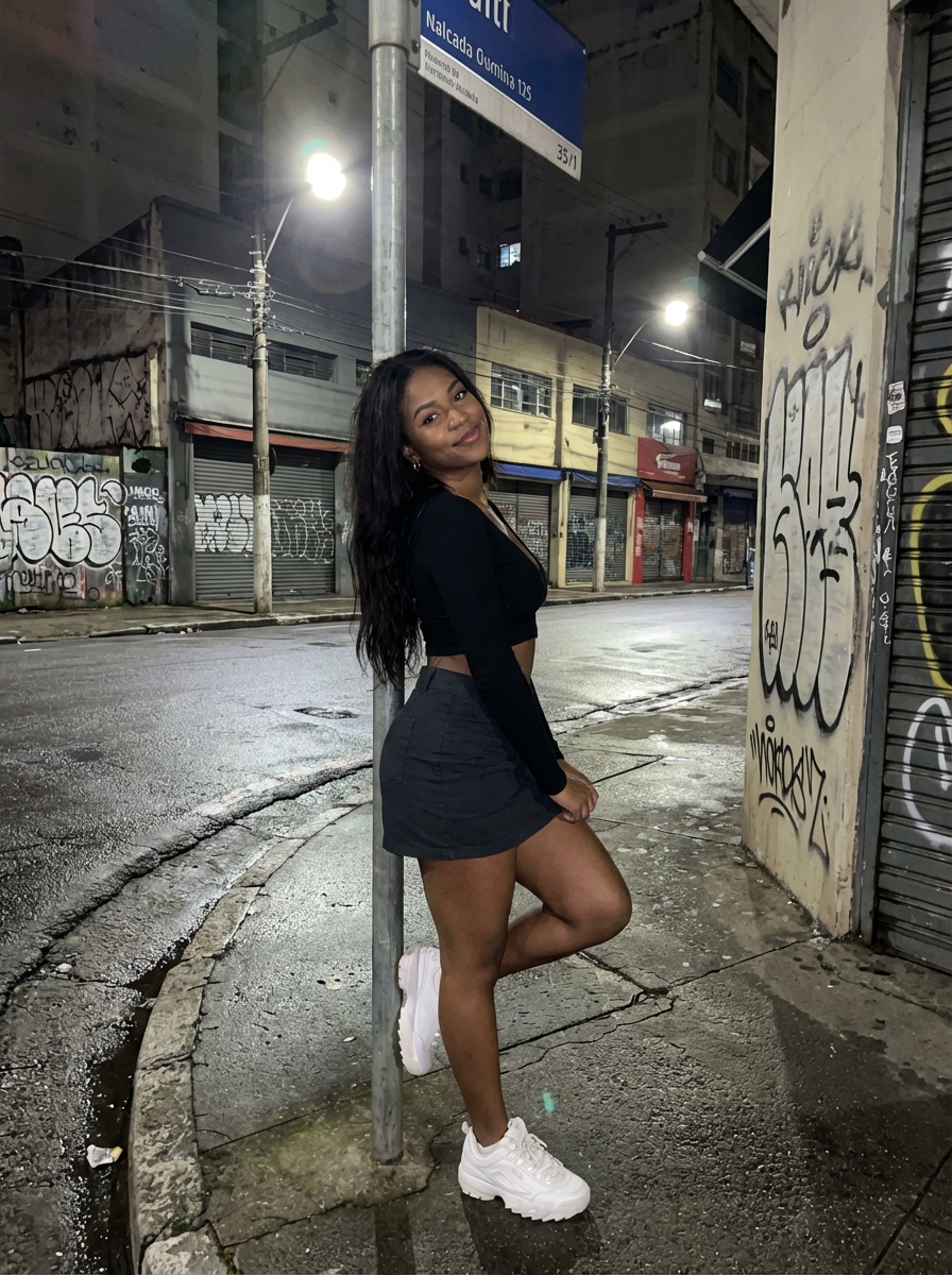 {"meta": {"aspect_ratio": "9:16", "resolution": "8k", "quality": "ultra_photorealistic", "camera": "iPhone 15 Pro Max", "lens": "24mm wide", "style": "raw iphone flash photo, no smoothing, realistic noise, social media night realism", "upload_look": "looks like straight-from-camera twitter post"}, "scene": {"location": "empty city street corner", "environment": ["closed small shops", "graffiti wall", "street sign pole", "wet asphalt reflecting light"], "time": "night, around 1–2 AM", "atmosphere": "quiet, reckless, spontaneous late-night energy"}, "lighting": {"type": "direct phone flash", "key_light": "strong frontal flash", "ambient_light": "dim street lights in background", "effect": ["bright skin highlights", "hard shadows behind subject", "flash shine on lips and eyes", "background falling into darkness"]}, "camera_perspective": {"pov": "third-person (photo taken by friend)", "angle": "slightly low angle", "distance": "1.5–2 meters", "framing": "full body but cropped mid-calf", "motion": "frozen candid moment, not posed"}, "subject": {"gender": "model", "age": "early 20s (clearly adult)", "ethnicity": "eastern / mix", "body": {"type": "curvy-slim", "waist": "tight", "hips": "round and full", "ass": "prominent from angle", "chest": "naturally full", "legs": "thick thighs, confident stance"}, "skin": {"tone": "light neutral", "texture": "visible pores, flash realism", "details": "slight shine from flash"}, "hair": {hair, "length": "long", "style": "loose straight hair", "movement": "slightly messy from night air"}, "face": {"expression": "bold, playful confidence", "eyes": "direct eye contact with camera", "makeup": "night-out makeup, glossy lips ", "vibe": "she knows this photo will go viral"}, "pose": {"stance": "standing with weight on one hip", "hips": "pushed slightly to the side", "upper_body": "torso angled toward camera", "legs": "one knee relaxed inward", "arms": {"one_hand": "lightly holding street sign pole", "other_hand": "resting on hip"}}, "outfit": {"top": {"type": "cropped fitted long-sleeve top", hair, "fit": "tight, no bra underneath", "detail": "fabric hugging chest naturally"}, "bottom": {"type": "low-rise if(gender=f){mini skirt } ", hair, "fit": "tight on hips, short hemline", "detail": "slight fabric tension visible"}, "footwear": {"type": "chunky sneakers", hair, "vibe": "casual late-night city model"}}}, "background_details": {"street_lights": "soft bokeh dots", "signage": "slightly readable but blurred", "ground": "wet pavement reflecting flash"}, "aesthetic_intent": ["twitter thirst trap energy", "flash photography confidence", "late night bad decisions vibe", "real model caught outside, not staged", "algorithm-friendly composition"]}