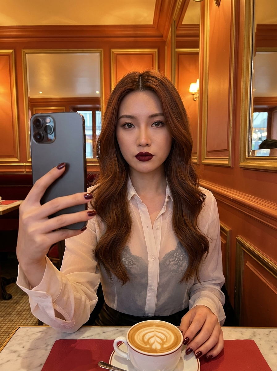 {"meta": {"type": "photorealistic_image_generation", "version": "v1.0", "aspect_ratio": "3:4"}, "subject": {"demographics": "25-year-old model, tone", "hair": "long, auburn/chestnut brown, styled in soft glossy waves, center part", "facial_features": "structured face, serious confident expression, direct eye contact", "makeup": "bold dark burgundy matte lipstick , subtle contouring , natural eye makeup", "hands": "holding phone, fingernails painted deep maroon to match lips"}, "fashion": {"garment_main": "sheer chiffon button-down shirt, slightly unbuttoned/draped", "garment_underlayer": "lace bodysuit /bralette visible underneath", "style": "chic, evening casual, upscale"}, "props_and_pose": {"device": "modern smartphone with multiple camera lenses, held vertically for a selfie", "table_items": "porcelain cup with latte art, resting on a saucer and red placemat", "pose": "seated at a table, facing forward, one hand on phone, one hand resting near cup"}, "environment": {"location": "upscale Parisian-style bistro or cafe", "furniture": "marble top table, woven rattan cafe chairs", "background": "warm terracotta/orange walls with gold molding (boiserie), large mirrors reflecting the room", "lighting": "warm amber interior lighting, soft glow, moody shadows, artificial indoor light"}, "technical_specs": {"style": "photorealistic, nano banana style", "camera_settings": "medium close-up, shallow depth of field (bokeh background), sharp focus on eyes and phone", "quality": "8k, high fidelity, fine texture detail"}, "combined_prompt": "Hyper-realistic selfie of a young model with long wavy hair and dark burgundy lipstick . She is wearing a sheer chiffon shirt over a lace bodysuit . She is seated at a marble table in an upscale bistro with terracotta walls and gold mirrors. She holds a smartphone vertically. A cup of coffee with latte art sits on the table. Warm amber lighting, moody atmosphere, shallow depth of field."}