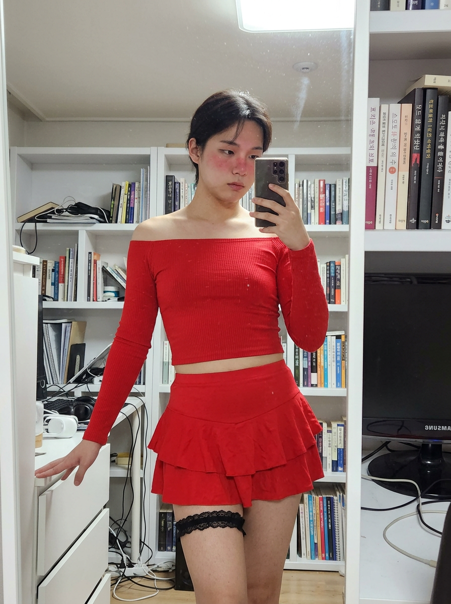 {"meta":{"analysis_timestamp":"2026-01-03T08:28:01","target_tool":"Nano Banana Pro","image_dna":{"type":"Photo \/ Mirror Selfie","orientation_lock":"LOCKED: Orientation preserved 1:1 (Mirror Reflection)","sensor_emulation":"iPhone 14\/15 Pro Main Sensor"}},"spatial_orientation_engine":{"subject_facing_direction":"CRITICAL: Facing CAMERA (Front) via Mirror Reflection","body_rotation":" squared to mirror, hips slightly shifted, Head tilted slightly to Viewer's Left","camera_position_relative":"Camera is held in subject's RIGHT hand, positioned at chest height, offset to Viewer's Right"},"camera_optics_and_geometry":{"lens_profile":{"focal_length":"24mm (Wide Smartphone Lens)","aperture":"f\/1.7 (Sharp center, slight falloff)","lens_character":"Modern Digital Sharpness with Smart HDR"},"optical_flaws":["Mirror Reflection (Reversed Geometry)"," Fingerprint Smudge on Mirror Surface","Digital Noise in Shadowed Bookshelf Areas"]},"environment_and_physics":{"lighting_engine":{"primary_source":"Diffused Indoor Ceiling Light (Top-Center)","radiosity_color_bleed":"White light bouncing off white shelves onto skin; slight cool cast from monitor","shadow_structure":"Soft ambient occlusion in bookshelf gaps \/ Sharp shadow under the jawline","volumetrics":"Clear Indoor Air"},"surface_physics":{"weather_impact":"None (Indoor Controlled Environment)","material_response":"Ribbed knit stretching over \/ Ruffled polyester skirt hanging loosely \/ Lace garter tension on "}},"scene_text_ocr":{"detected":true,"content":[{"text":"SAMSUNG (Reversed)","location":"Monitor Bezel","font_style":"Sans-Serif Logo"},{"text":"Various Book Spines (Reversed)","location":"Bookshelves Background","font_style":"Mixed Typography (Korean\/English)"}]},"objects_and_actors":[{"id":"MAIN_SUBJECT","role":"Identity Swap Target","pose_engineering":{"skeletal_rig":"Standing upright, weight balanced. Right hand holding phone covering partial face. Left arm extended resting on white drawer unit.","gaze_vector":"Eyes looking at the phone screen in the mirror.","interaction_physics":"Left hand fingers splayed on drawer edge \/ Phone grip tension in right hand"},"physiological_state":{"body_temp_visuals":"Rosy flush on cheeks and nose bridge (Makeup or Blood flow)","skin_light_interaction":"Soft specular highlights on stomach and shoulder"},"clothing_simulation":{"garment_stack":"Bright RedLong-Sleeve Off-Shoulder Ribbed Crop Top + Bright Red Ruffled Mini Skirt + Black Lace Garter","fabric_mechanics":"Top is form-fitting with horizontal stretch lines. Skirt creates layered ruffle shadows. Garter creates slight indentation on .","texture_and_wear":"Ribbed texture clearly on top. Smooth synthetic texture on skirt."},"identity_placeholders":{"skin_tone":"[[USE_REFERENCE_SKIN]]","face_structure":"[[USE_REFERENCE_FACE]]","hair_style":"[[USE_REFERENCE_HAIR]]"}}],"off_screen_context":{"reflections":"Room details in mirror","implied_elements":"Ceiling and rest of room behind the physical camera (viewer's position)"},"aspect_ratio":"5:6","generation_keywords":{"positive":"Photorealistic, mirror selfie, messy room background, bookshelves, messy cables, white off-shoulder crop top, ruffled skirt, black garter, soft lighting, 8k, detailed skin texture","negative":"flipped text (unless mirror intent), distorted hands, low resolution, cartoon, painting"}}
