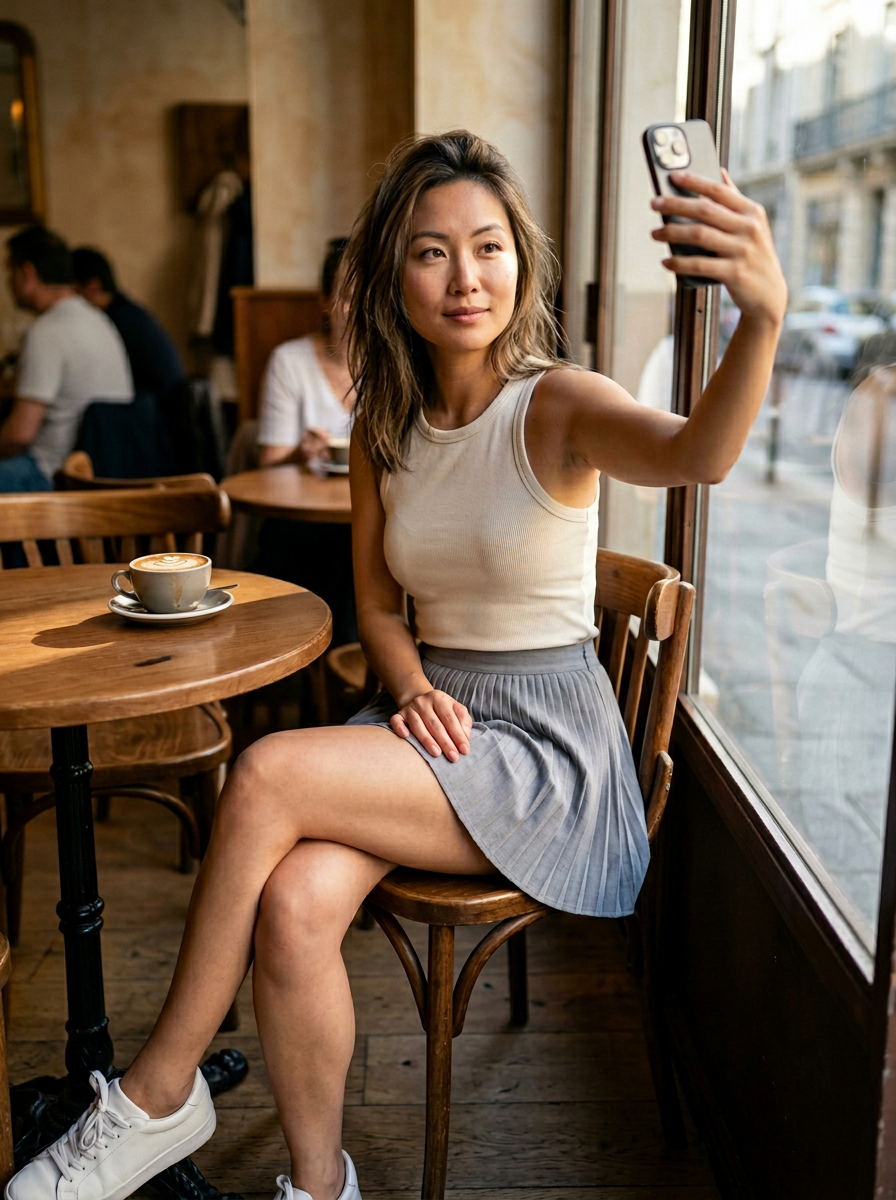 {"meta":{"aspect_ratio":"4:5","resolution":"8k","quality":"ultra_photorealistic","camera":"iPhone 15 Pro Max","lens":"26mm wide","image_style":"raw iphone photo, no beauty filter, subtle grain, social media realism","compression":"light jpeg compression like real instagram (do not show layout or UI) upload"},"scene":{"location":"small aesthetic city caf\u00e9","country_feel":"southern europe","interior":["wooden round table","simple ceramic coffee cup","large window with soft daylight","street reflections on glass"],"time":"late afternoon","atmosphere":"quiet caf\u00e9 tension, people nearby but ignoring her, public moment"},"lighting":{"type":"natural window light","direction":"side-lit","color_temperature":"neutral-warm daylight","intensity":"medium soft","effect":["soft highlight on cheekbones","gentle shadow under chest","natural depth on waist curve","skin glow shine"]},"camera_perspective":{"pov":"we are her phone","angle":"slightly high selfie angle","distance":"arm length","framing":"mid- to head","crop":"casual imperfect framing","motion":"very slight hand shake realism"},"subject":{"gender":"female","age":"early 20s (clearly adult)","ethnicity":"asian\u2013european mix","body":{"type":"soft-curvy instagram (do not show layout or UI) model","waist":"small and tight","hips":"round and feminine"," ":"full but natural","chest":"medium-full, natural","legs":"thick smooth ","posture":"relaxed but aware of body"},"skin":{"tone":"light warm beige","texture":"real pores, no blur","details":"slight warmth from daylight"},"hair":{"color":"dark blonde","length":"long","style":"loose, slightly messy","details":"a few strands falling across chest and shoulder"},"face":{"expression":"soft seductive calm","eyes":{"state":"half-lidded","direction":"looking directly into camera"},"brows":"natural, relaxed","lips":{"shape":"full","state":"slightly parted","finish":"clear gloss"},"makeup":"minimal, skin-focused, natural blush"},"pose":{"position":"sitting sideways on caf\u00e9 chair","hips":"angled toward camera","legs":{"arrangement":"one leg bent slightly, closest to camera","effect":" visually dominant in frame"},"upper_body":{" ":"slight lean back","shoulders":"relaxed"},"arms":{"phone_hand":"holding phone above face","free_hand":"resting on "}},"outfit":{"top":{"type":"thin ribbed tank top","color":"cream","fit":"tight, no bra underneath","fabric_behavior":"slightly stretched over chest"},"bottom":{"type":"micro pleated skirt","color":"soft grey","fit":"sits high on hips","detail":"fabric folds , riding slightly due to sitting"}}},"environmental_details":{"background_people":"blurred, out of focus","window_reflections":"street movement barely ","table_items":["half-finished coffee","phone shadow on table"]},"aesthetic_intent":["instagram (do not show layout or UI) explore page energy","looks accidental but intentional","public but ","soft femininity with tension","real girl, not AI-looking"]}