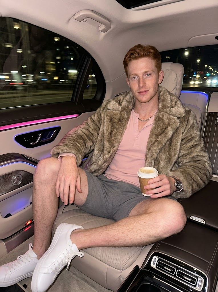 {"meta":{"aspect_ratio":"9:16","quality":"ultra_photorealistic","resolution":"8k","camera":"iPhone 17 Pro Max","lens":"24mm","style":"hyper-realistic luxury lifestyle, but natural"},"scene":{"location":"luxury car interior (Mercedes class)","environment":["soft pink and blue ambient cabin lighting","dashboard neon glow reflecting softly on skin","city lights passing outside the windows","warm, enclosed, late-night atmosphere"],"lighting":{"type":"soft neon ambient","key_light":"pink dashboard glow highlighting jawline and neck","fill_light":"subtle blue ambient light shaping face and silhouette","effect":"natural skin shine, realistic reflections"},"time":"late night"},"camera_perspective":{"pov":"casual handheld shot from passenger seat","angle":"slightly low angle, flattering and ","framing":"close lifestyle framing \u2014 face, upper body, hands, coffee cup ","energy":"caught-in-the-moment, candid luxury vibe"},"subject":{"gender":"male","age":"early 20s (clearly adult)","appearance_style":"natural handsome","body":{"type":"athletic muscular build","waist":"lean tapered","hips":"narrow","chest":"broad shoulders, defined natural proportions"},"skin":{"tone":"very fair porcelain","details":["light freckles across nose and upper cheeks","realistic skin texture","soft natural glow, natural features"]},"hair":{"color":"natural copper red","style":"short, textured tousled cut","behavior":"a few loose strands falling naturally over forehead"},"face":{"expression":"relaxed, confident half-smile","eyes":"light blue-grey, calm and engaging gaze","lips":"natural matte finish, softly parted","makeup":"clean groomed \u2014 natural features, natural lashes, soft highlight, light stubble"},"pose":{"upper_body":"leaning slightly forward into the seat","hands":{"right_hand":"holding a warm coffee cup near chest level","left_hand":"resting naturally on upper "},"legs":"relaxed seated posture","vibe":"effortless confidence, relaxed masculinity"},"outfit":{"top":{"type":"luxury faux fur coat","style":"open at the front, a fitted pastel henley underneath","fabric_behavior":"soft folds, natural drape"},"bottom":{"type":"tailored shorts","color":"pastel blue or soft grey","fit":"tailored, elegant, comfortable"},"legs":{"details":" toned legs, smooth texture, natural sheen"}},"accessories":{"jewelry":["simple silver chain resting at the neckline","chunky wrist watch"],"prop":"coffee cup with steam"}},"style_notes":{"realism":"smartphone lifestyle realism","avoid":["exaggerated anatomy","explicit ","studio or fashion-shoot posing"],"goal":"looks like a real late-night luxury car selfie, not AI-generated"},"negative_prompt":["cartoon look","over-smooth skin","plastic face","extreme bokeh","studio lighting","AI beauty filter"]}