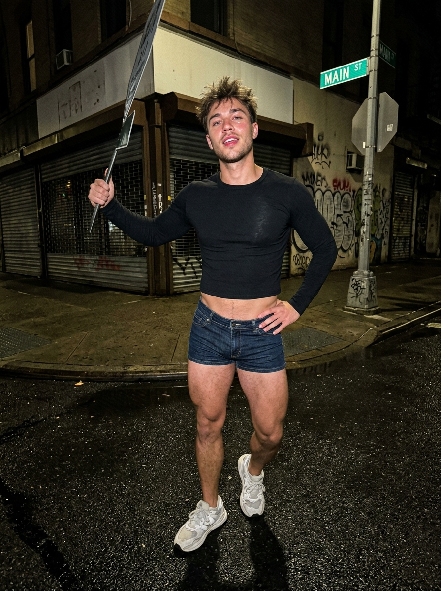 {"meta":{"aspect_ratio":"9:16","resolution":"8k","quality":"ultra_photorealistic","camera":"iPhone 15 Pro Max","lens":"24mm wide","style":"raw iphone flash photo, no smoothing, realistic noise, social media night realism","upload_look":"looks like straight-from-camera twitter post"},"scene":{"location":"empty city street corner","environment":["closed small shops","graffiti wall","street sign pole"," asphalt reflecting light"],"time":"night, around 1\u20132 AM","atmosphere":"quiet, reckless, spontaneous late-night energy"},"lighting":{"type":"direct phone flash","key_light":"strong frontal flash","ambient_light":"dim street lights in background","effect":["bright skin highlights","hard shadows behind subject","flash shine on lips and eyes","background falling into darkness"]},"camera_perspective":{"pov":"third-person (photo taken by friend)","angle":"slightly low angle","distance":"1.5\u20132 meters","framing":"full body but cropped mid-calf","motion":"frozen candid moment, not posed"},"subject":{"gender":"male","age":"early 20s (clearly adult)","ethnicity":"eastern \/ mix","body":{"type":"athletic-muscular","waist":"tight","hips":"narrow V-taper"," ":"firm and prominent from angle","chest":"defined pecs","legs":"muscular , confident stance"},"skin":{"tone":"light neutral","texture":" pores, flash realism","details":"slight shine from flash"},"hair":{"length":"short","style":"tousled textured cut","movement":"slightly messy from night air"},"face":{"expression":"bold, playful confidence","eyes":"direct eye contact with camera","makeup":"night-out grooming, natural lips, light stubble","vibe":"he knows this photo will go viral"},"pose":{"stance":"standing confidently with weight on one leg","hips":"relaxed to the side","upper_body":" angled toward camera","legs":"one knee relaxed inward","arms":{"one_hand":"lightly holding street sign pole","other_hand":"resting on hip"}},"outfit":{"top":{"type":"cropped fitted long-sleeve t-shirt","fit":"tight, athletic build","detail":"fabric hugging chest naturally"},"bottom":{"type":"low-rise shorts","fit":"tight on , short hemline","detail":"slight fabric tension "},"footwear":{"type":"chunky sneakers","vibe":"casual late-night city model"}}},"background_details":{"street_lights":"soft bokeh dots","signage":"slightly readable but blurred","ground":" pavement reflecting flash"},"aesthetic_intent":["twitter thirst trap energy","flash photography confidence","late night bad decisions vibe","real model caught outside, not staged","algorithm-friendly composition"]}