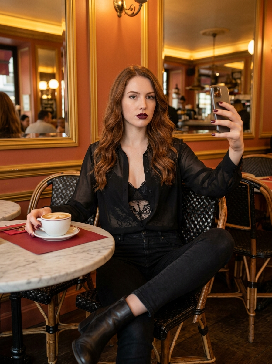 {"meta":{"type":"photorealistic_image_generation","version":"v1.0","aspect_ratio":"3:4"},"subject":{"demographics":"25-year-old model, tone","hair":"long, auburn\/chestnut brown, styled in soft glossy waves, center part","facial_features":"structured face, serious confident expression, direct eye contact","makeup":"bold dark burgundy matte lipstick , subtle contouring , natural eye makeup","hands":"holding phone, fingernails painted deep maroon to match lips"},"fashion":{"garment_main":"sheer chiffon button-down shirt, slightly unbuttoned\/draped","garment_underlayer":"lace bodysuit \/bralette visible underneath","style":"chic, evening casual, upscale"},"props_and_pose":{"device":"modern smartphone with multiple camera lenses, held vertically for a selfie","table_items":"porcelain cup with latte art, resting on a saucer and red placemat","pose":"seated at a table, facing forward, one hand on phone, one hand resting near cup"},"environment":{"location":"upscale Parisian-style bistro or cafe","furniture":"marble top table, woven rattan cafe chairs","background":"warm terracotta\/orange walls with gold molding (boiserie), large mirrors reflecting the room","lighting":"warm amber interior lighting, soft glow, moody shadows, artificial indoor light"},"technical_specs":{"style":"photorealistic, nano banana style","camera_settings":"medium close-up, shallow depth of field (bokeh background), sharp focus on eyes and phone","quality":"8k, high fidelity, fine texture detail"},"combined_prompt":"Hyper-realistic selfie of a young model with long wavy hair and dark burgundy lipstick . She is wearing a sheer chiffon shirt over a lace bodysuit . She is seated at a marble table in an upscale bistro with terracotta walls and gold mirrors. She holds a smartphone vertically. A cup of coffee with latte art sits on the table. Warm amber lighting, moody atmosphere, shallow depth of field."}