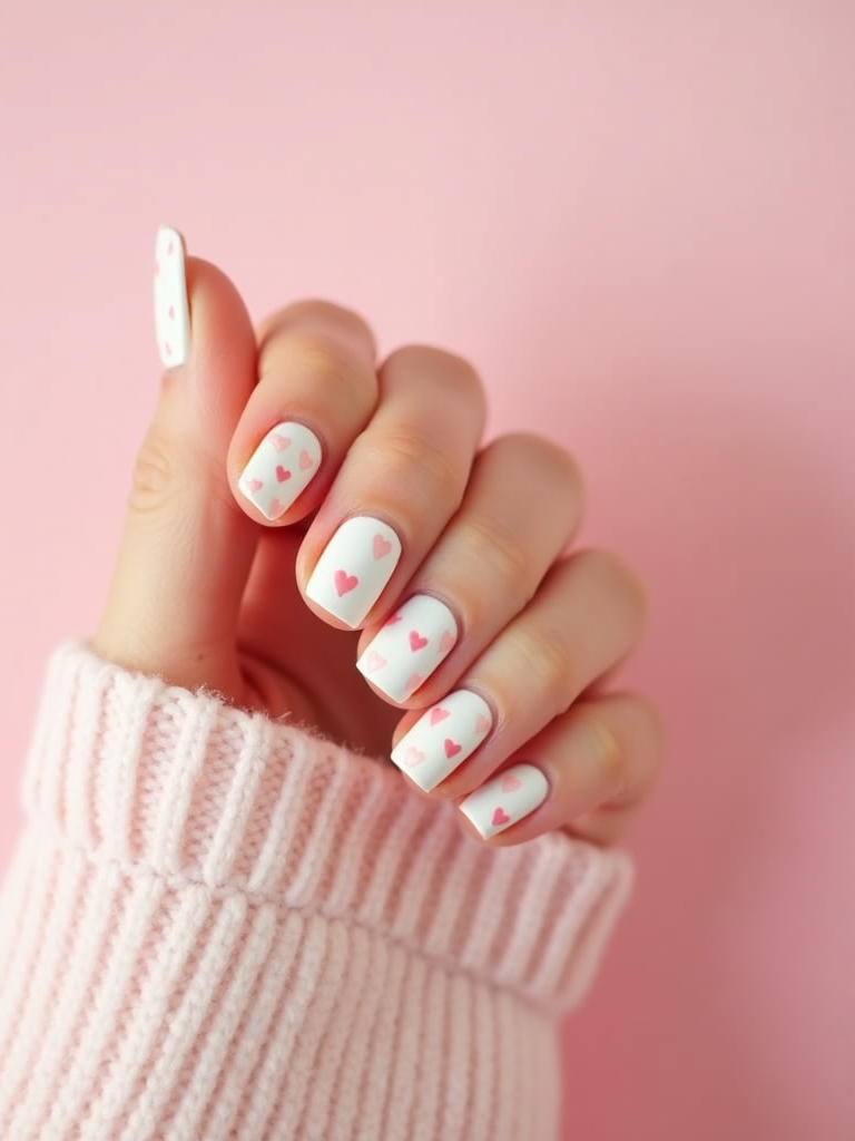 milky white nails with tiny pink hearts, romantic aesthetic, pastel background, cute styling, feminine hand pose, social media-friendly lighting