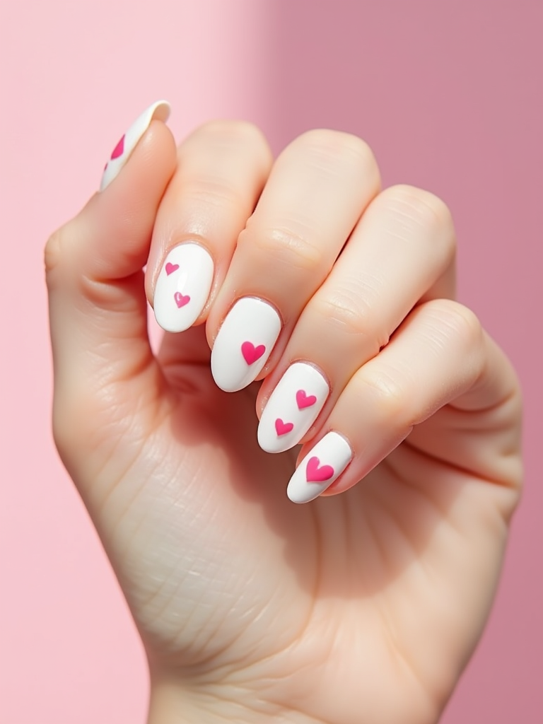 milky white nails with tiny pink hearts, romantic aesthetic, pastel background, cute styling, feminine hand pose, social media-friendly lighting