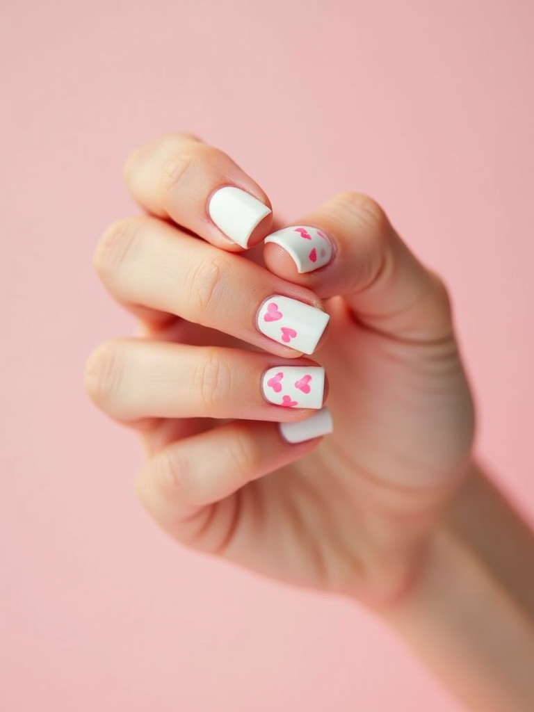 milky white nails with tiny pink hearts, romantic aesthetic, pastel background, cute styling, feminine hand pose, social media-friendly lighting