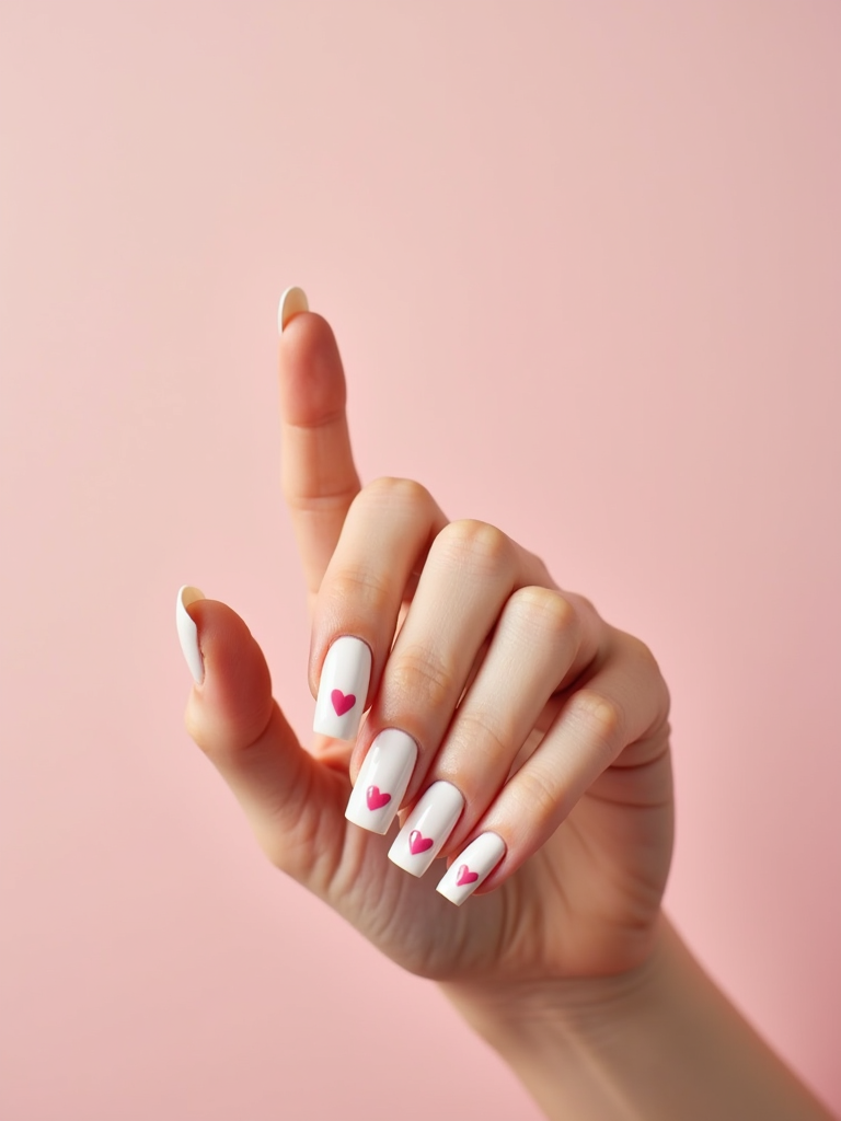 milky white nails with tiny pink hearts, romantic aesthetic, pastel background, cute styling, feminine hand pose, social media-friendly lighting