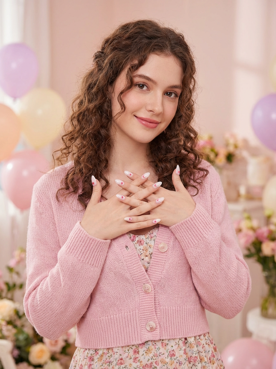 milky white nails with tiny pink hearts, romantic aesthetic, pastel background, cute styling, feminine hand pose, social media-friendly lighting