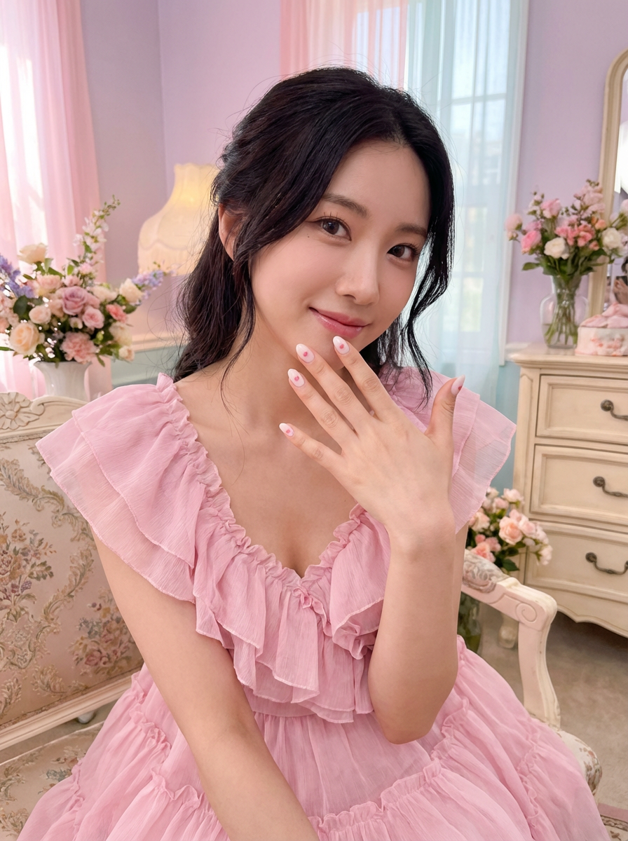 milky white nails with tiny pink hearts, romantic aesthetic, pastel background, cute styling, feminine hand pose, social media-friendly lighting