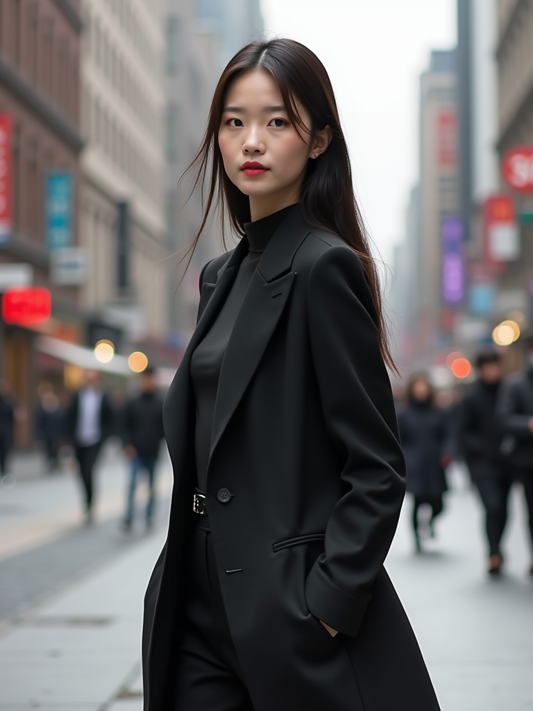 minimalist feminine model in a sleek monochrome outfit on a city street