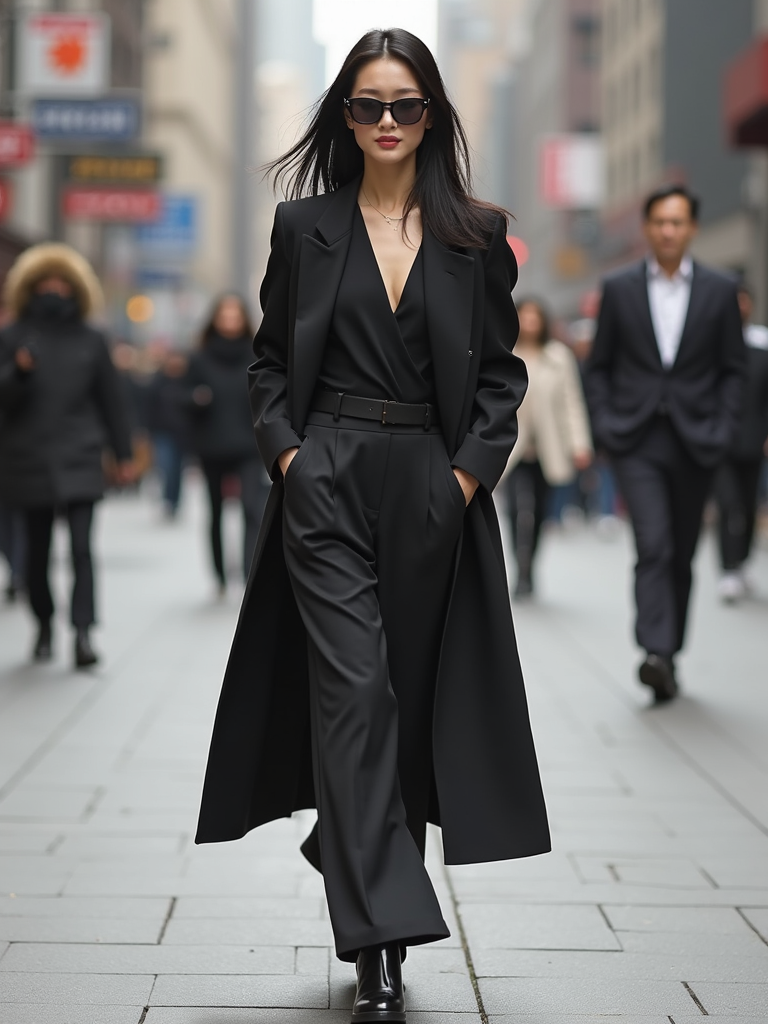 minimalist feminine model in a sleek monochrome outfit on a city street