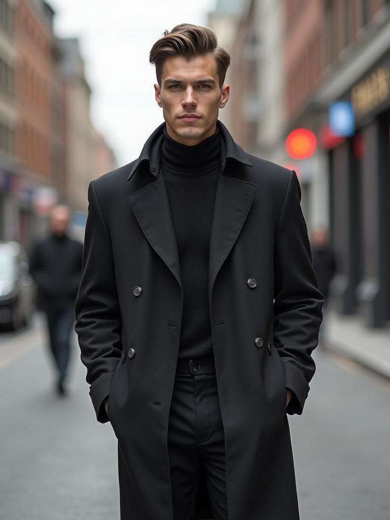 minimalist masculine model in a sleek monochrome outfit on a city street