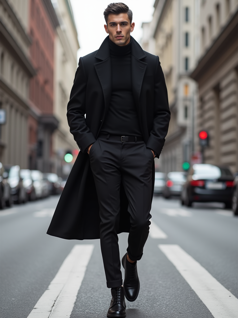 minimalist masculine model in a sleek monochrome outfit on a city street