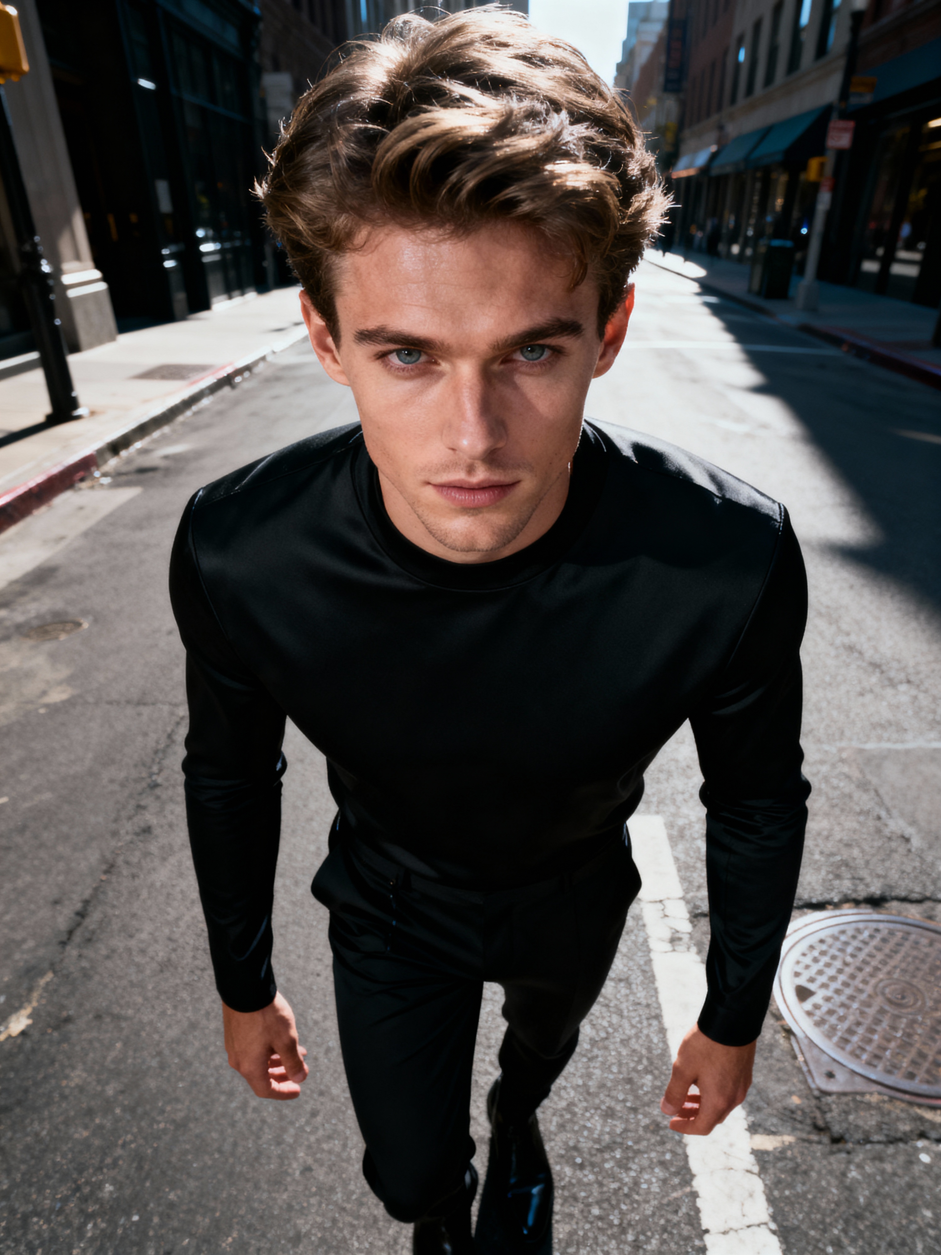 minimalist masculine model in a sleek monochrome outfit on a city street