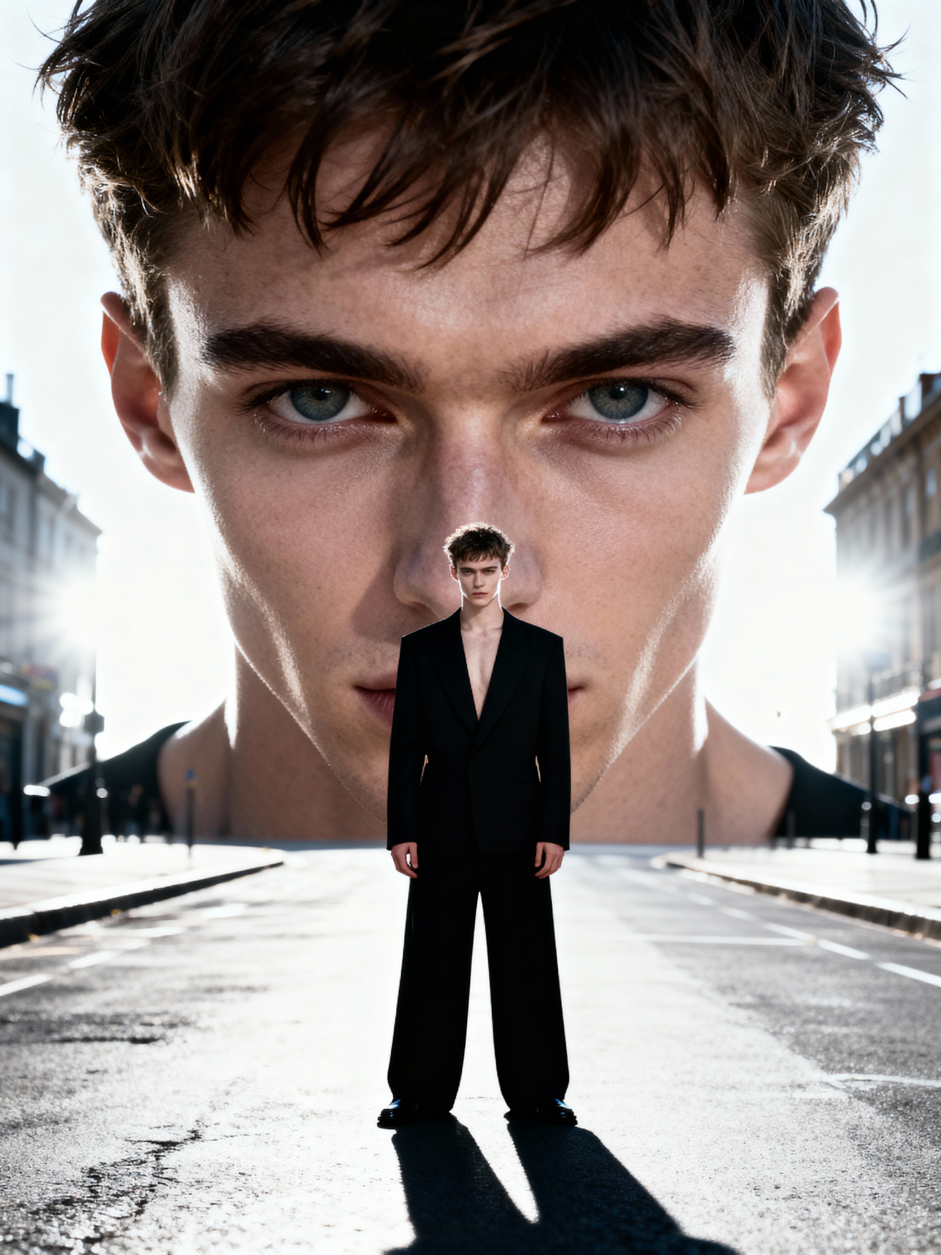 minimalist masculine model in a sleek monochrome outfit on a city street