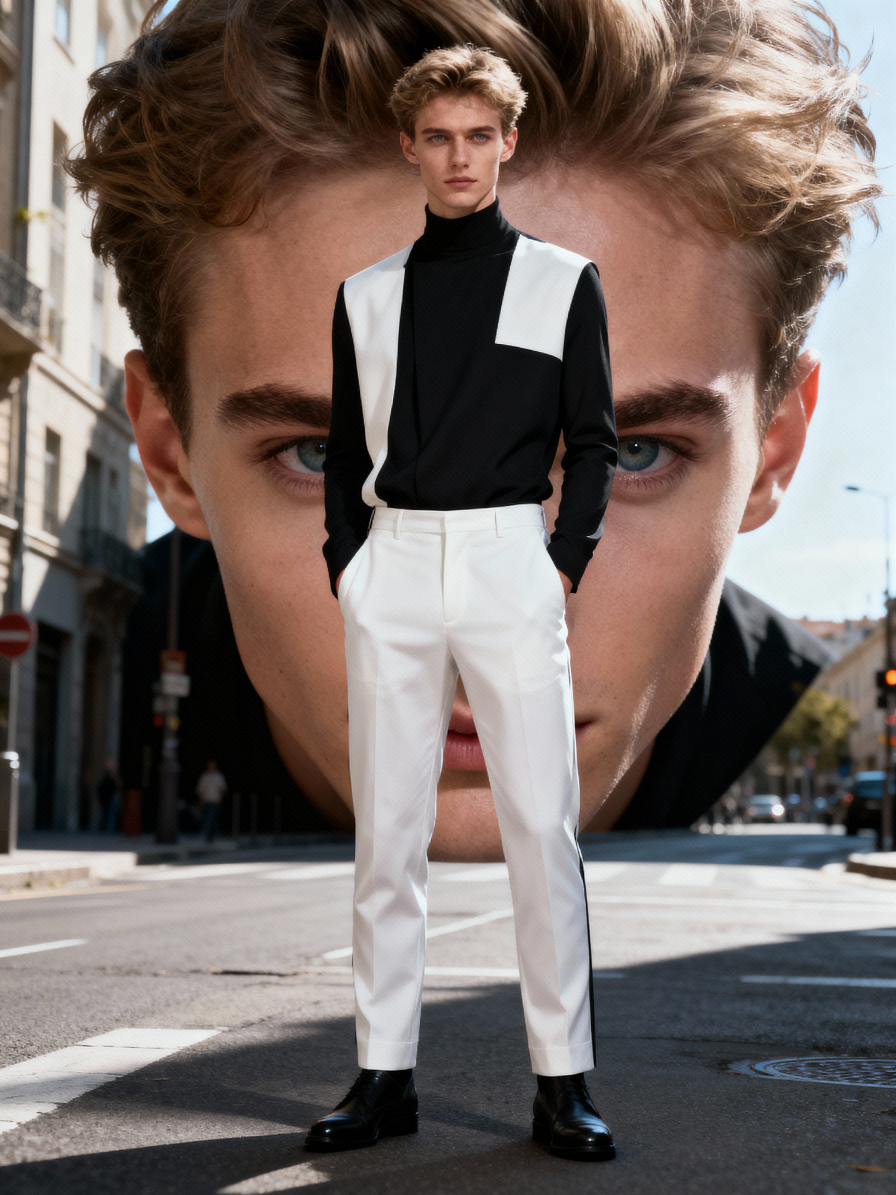 minimalist masculine model in a sleek monochrome outfit on a city street