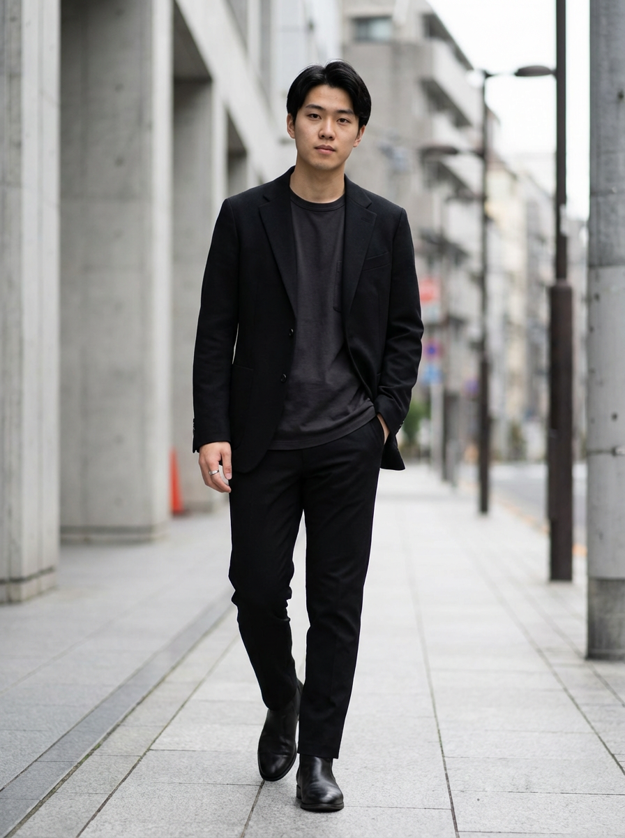 minimalist masculine model in a sleek monochrome outfit on a city street