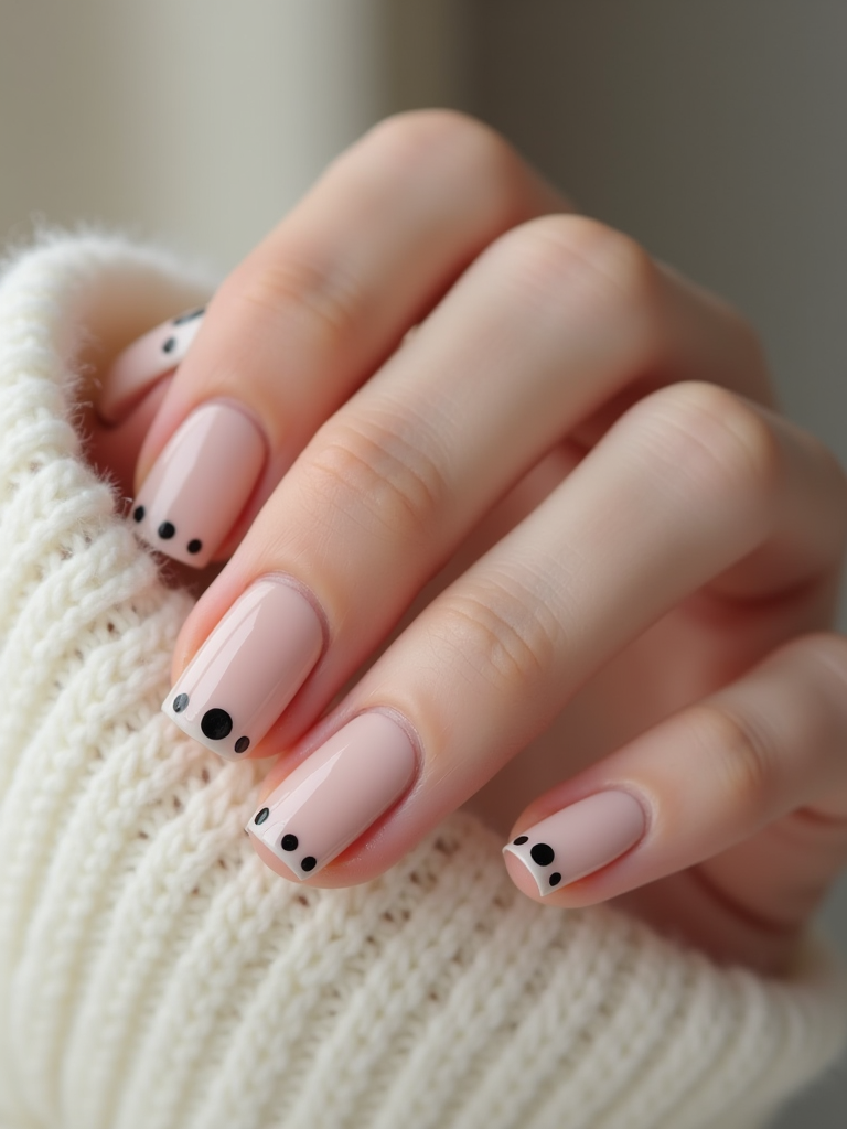minimalist nude nails with a single black dot on each, ultra-clean style, Scandinavian aesthetic, close-up on detail