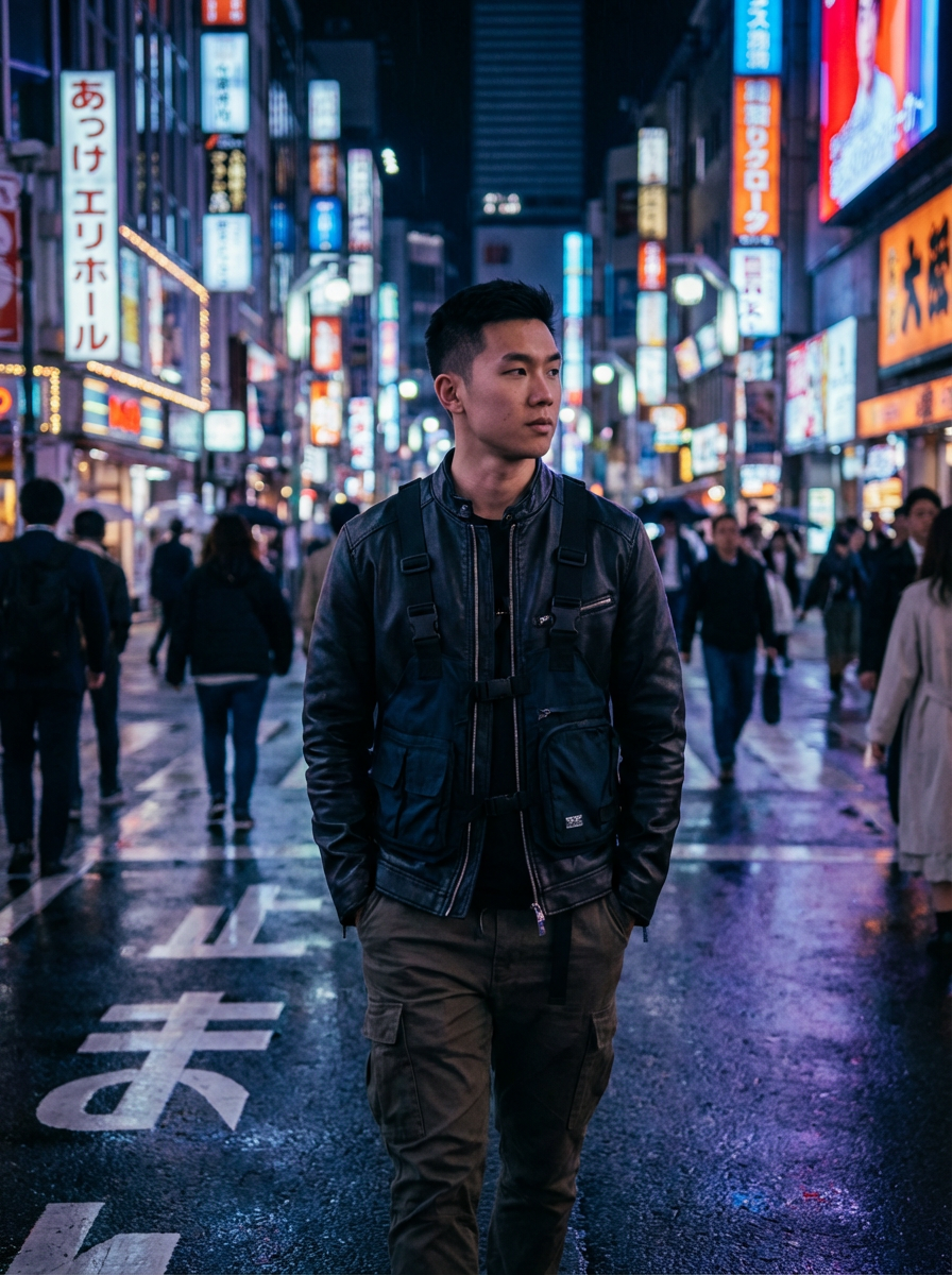 Model alking through the streets of Tokyo at night. Leather jacket, cyberpunk techwear, glowing background. AI cinematic photography.