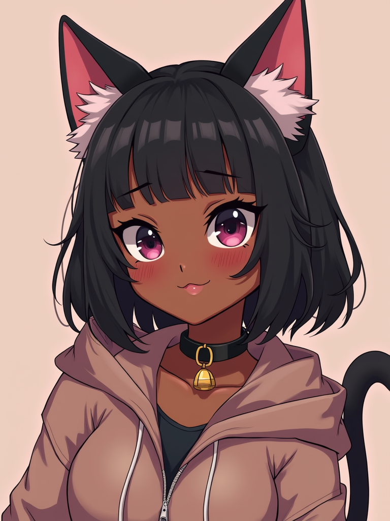 Model as a Catgirl. Wearing cat ears, cute oversized hoodie, choker with bell, playful expression . Kawaii anime-inspired look.