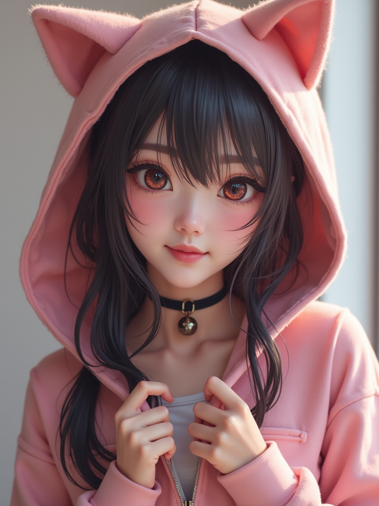 Model as a Catgirl. Wearing cat ears, cute oversized hoodie, choker with bell, playful expression . Kawaii anime-inspired look.
