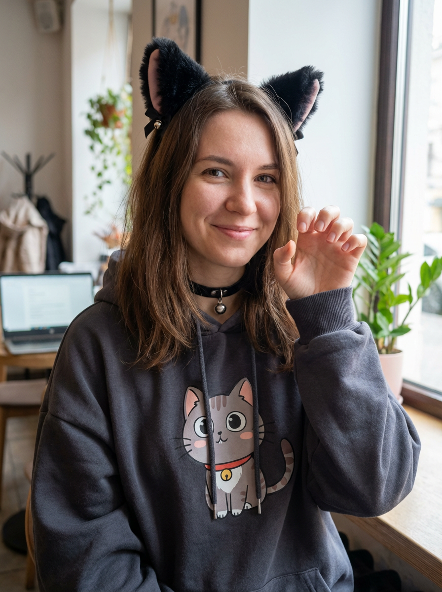 Model as a Catgirl. Wearing cat ears, cute oversized hoodie, choker with bell, playful expression . Kawaii anime-inspired look.