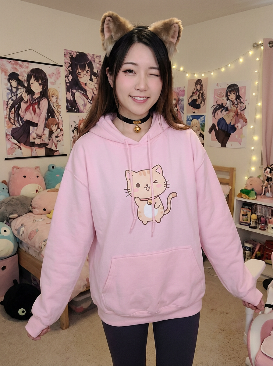 Model as a Catgirl. Wearing cat ears, cute oversized hoodie, choker with bell, playful expression . Kawaii anime-inspired look.