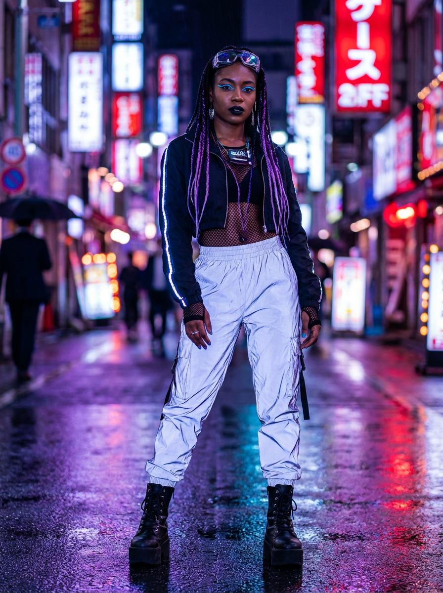 Model as a cyberpunk E-Girl transformation. Dark lipstick, neon eyeliner, futuristic fashion . Tokyo street-style lighting.