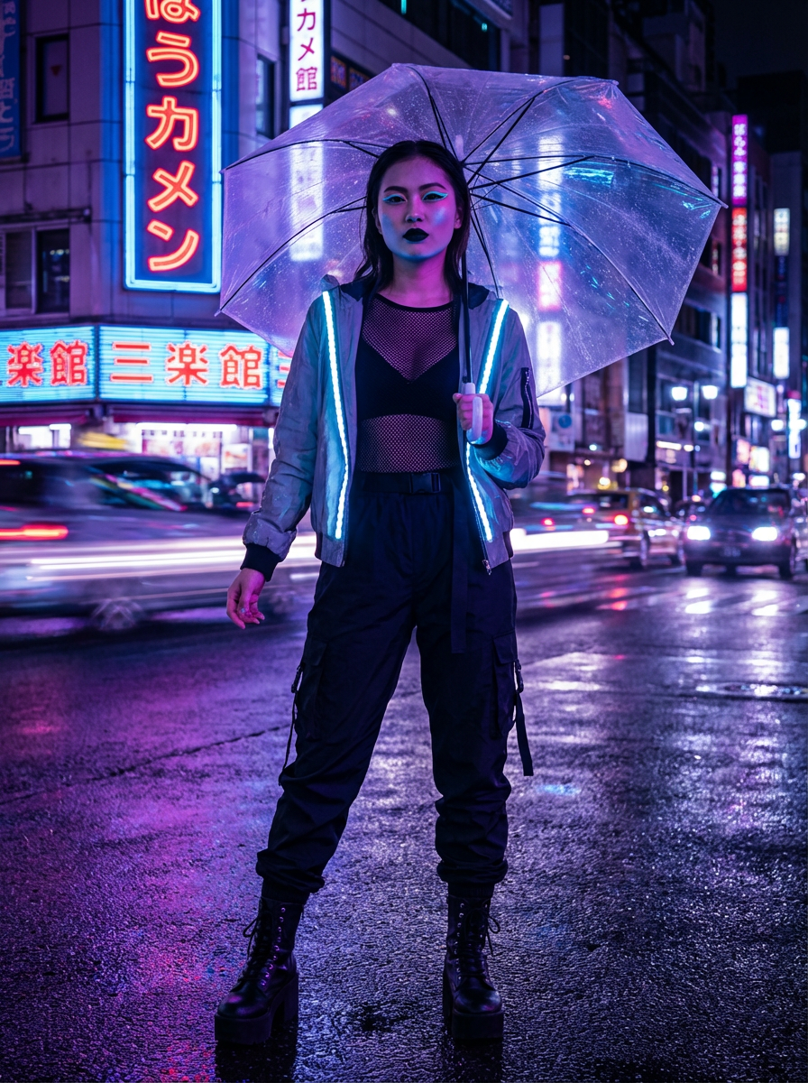 Model as a cyberpunk E-Girl transformation. Dark lipstick, neon eyeliner, futuristic fashion . Tokyo street-style lighting.