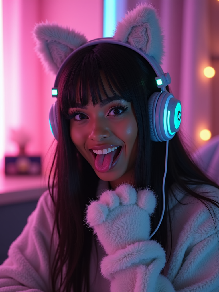 Model as a gaming Catgirl. Cat ear headphones, paw gloves, cute pastel gaming setup . Cozy streaming room aesthetic. The person appears to be sticking out their tongue in a playful or edgy expression.