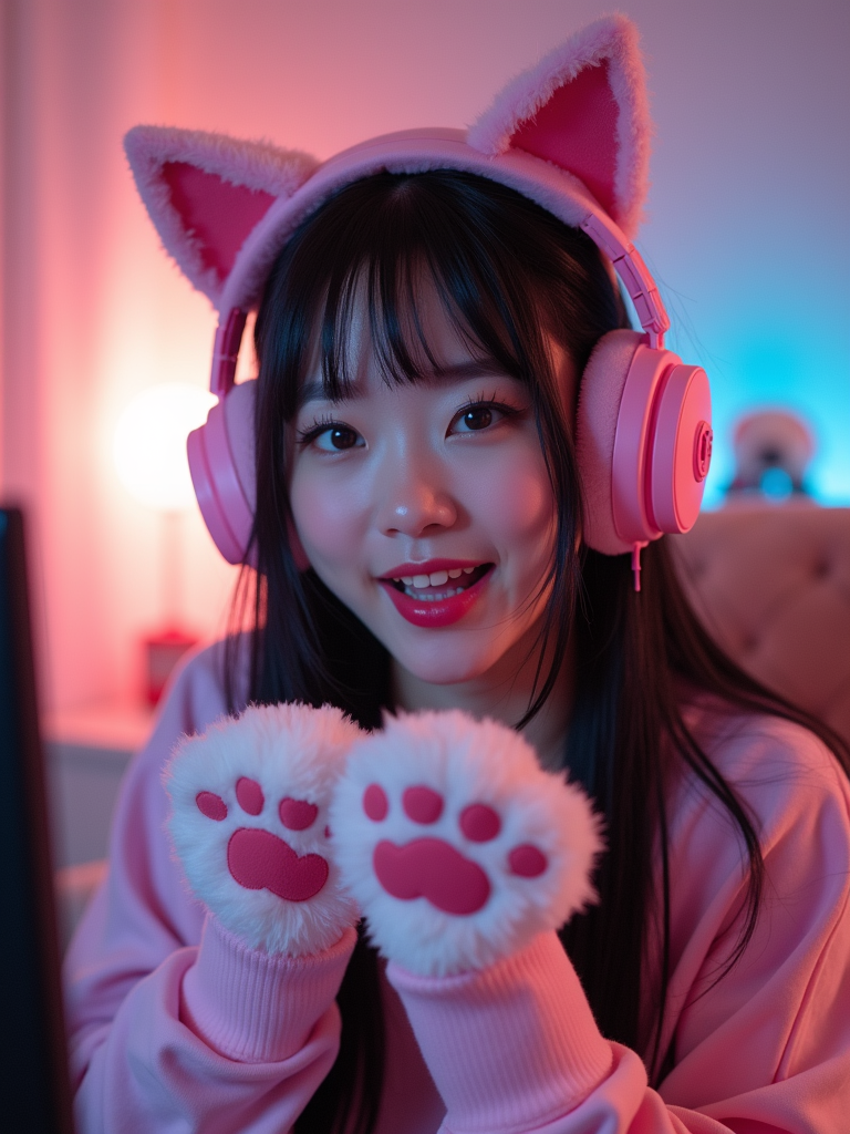 Model as a gaming Catgirl. Cat ear headphones, paw gloves, cute pastel gaming setup . Cozy streaming room aesthetic. The person appears to be sticking out their tongue in a playful or edgy expression.