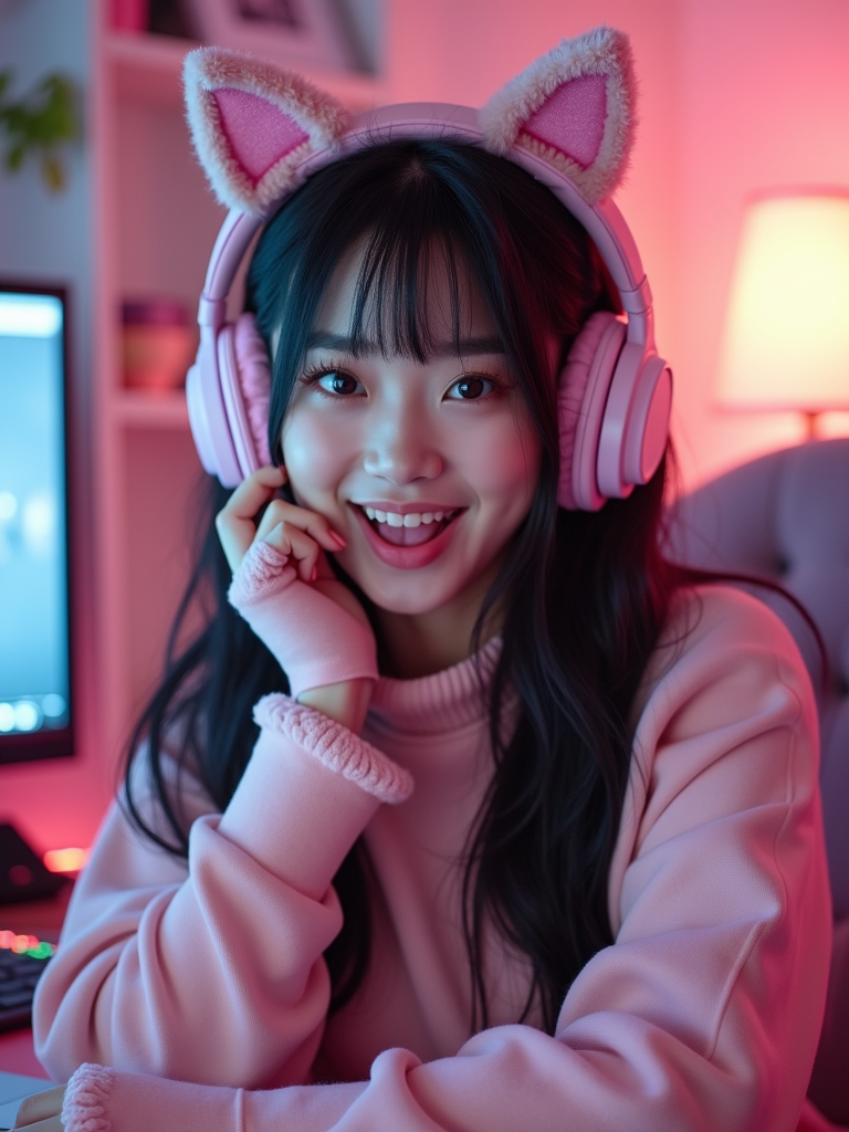 Model as a gaming Catgirl. Cat ear headphones, paw gloves, cute pastel gaming setup . Cozy streaming room aesthetic. The person appears to be sticking out their tongue in a playful or edgy expression.