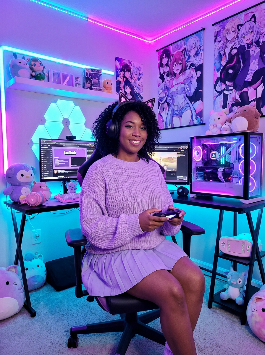 Model as a gaming E-Girl photoshoot. Cat ear headphones, neon-lit gaming room, pastel sweater . Streaming setup aesthetic.