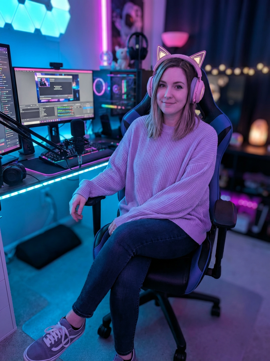 Model as a gaming E-Girl photoshoot. Cat ear headphones, neon-lit gaming room, pastel sweater . Streaming setup aesthetic.