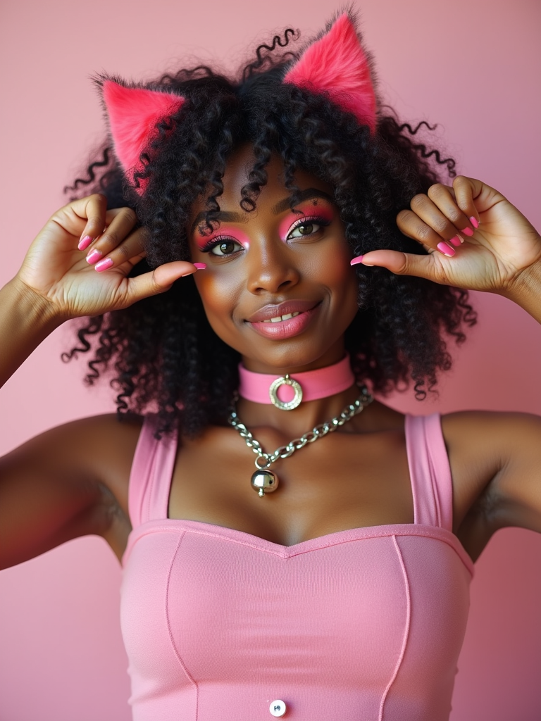 Model as a kawaii Catgirl. Pink cat ears, cute collar with bell, playful pose with paw gestures . Japanese street fashion inspired.