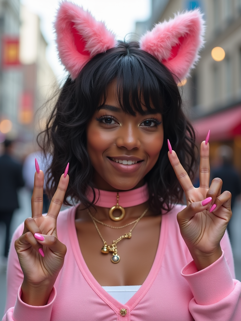 Model as a kawaii Catgirl. Pink cat ears, cute collar with bell, playful pose with paw gestures . Japanese street fashion inspired.