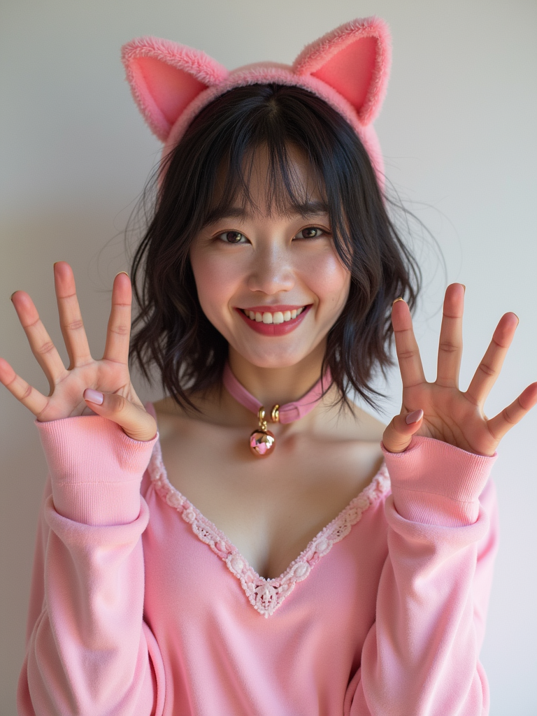 Model as a kawaii Catgirl. Pink cat ears, cute collar with bell, playful pose with paw gestures . Japanese street fashion inspired.