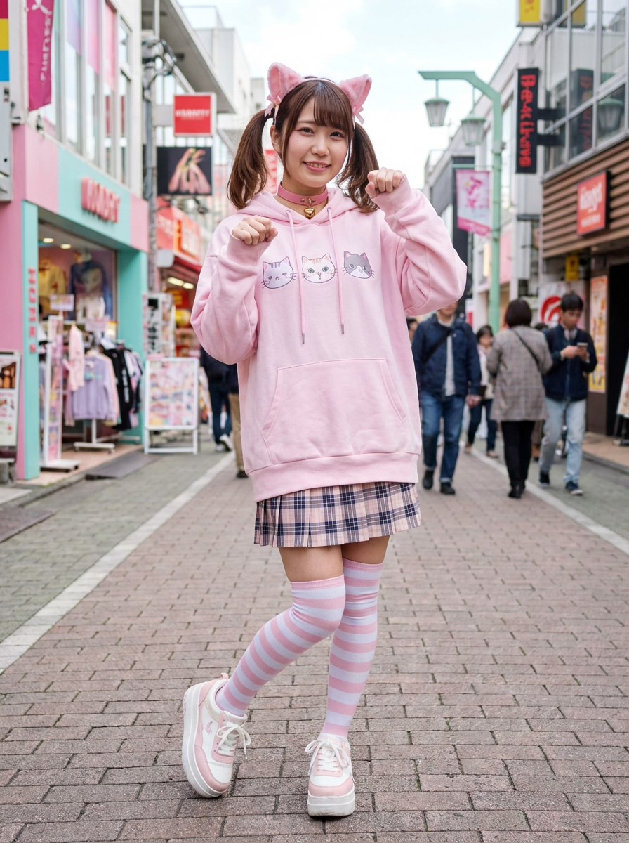 Model as a kawaii Catgirl. Pink cat ears, cute collar with bell, playful pose with paw gestures . Japanese street fashion inspired.