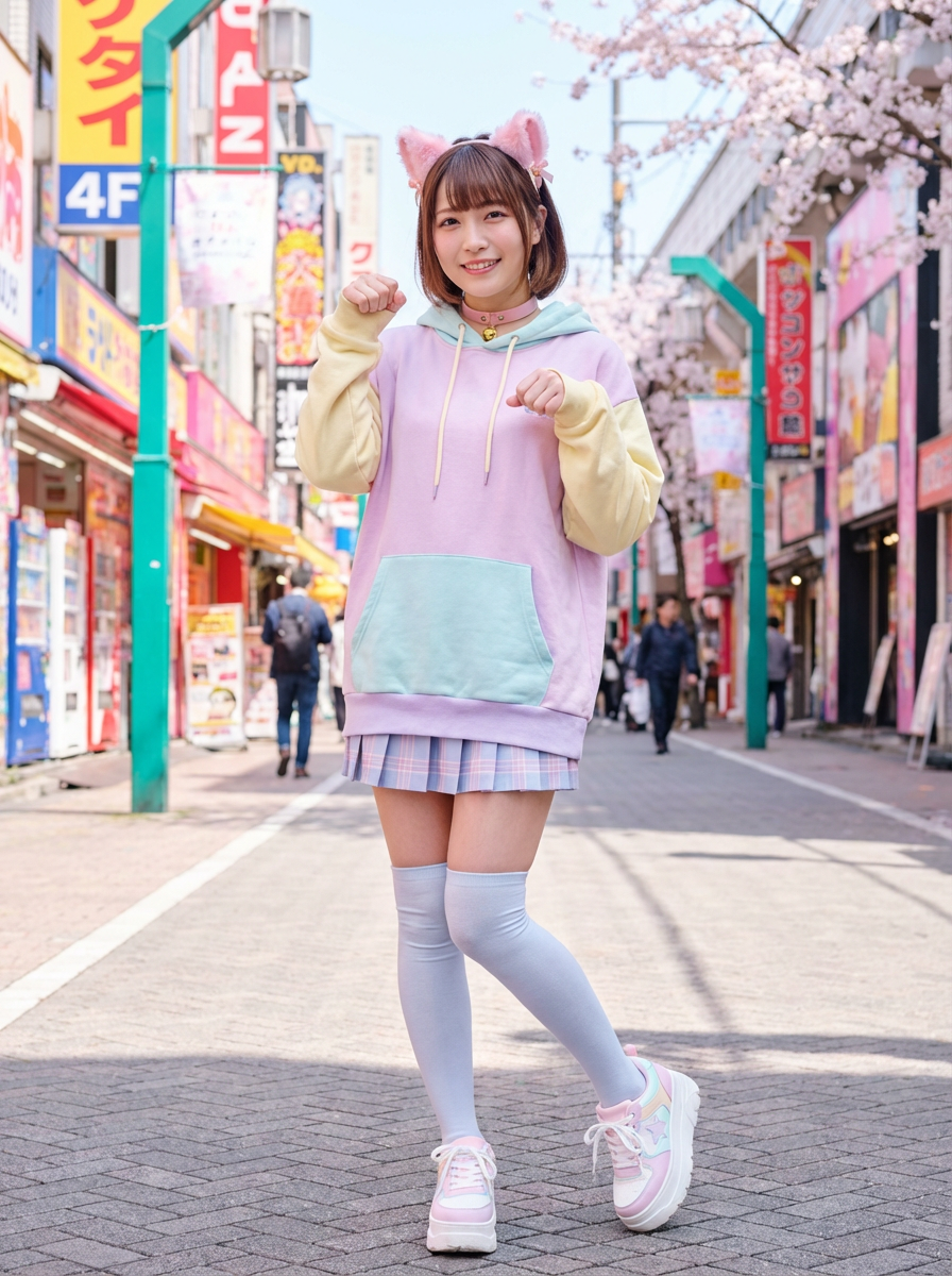 Model as a kawaii Catgirl. Pink cat ears, cute collar with bell, playful pose with paw gestures . Japanese street fashion inspired.