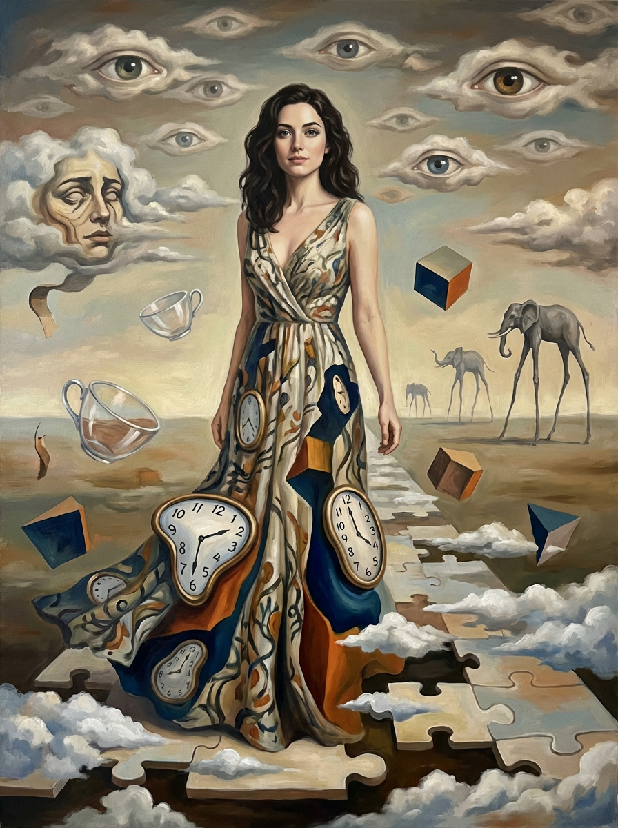 Model as a surrealist art portrait. Dreamlike elements, floating objects . Dali-inspired style.
