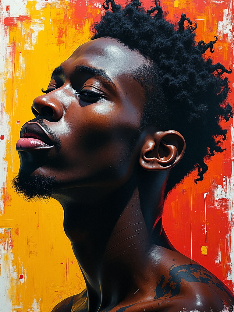 Model as an abstract expressionist portrait. Bold gestures, artistic energy. Pollock-inspired style.