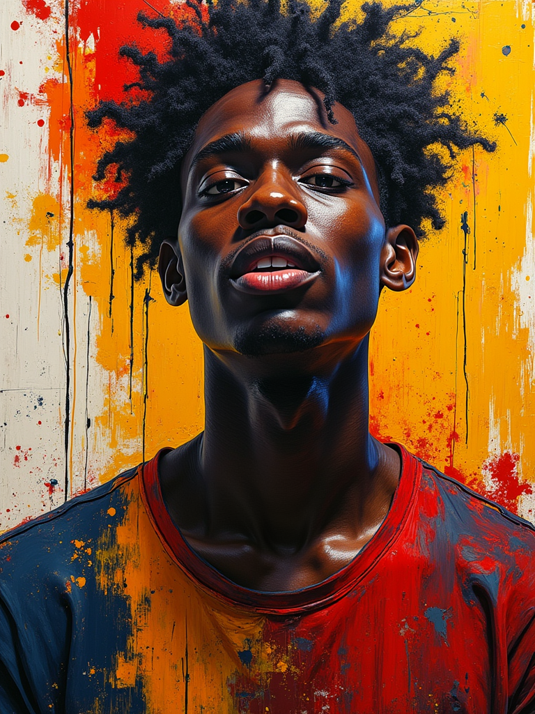 Model as an abstract expressionist portrait. Bold gestures, artistic energy. Pollock-inspired style.