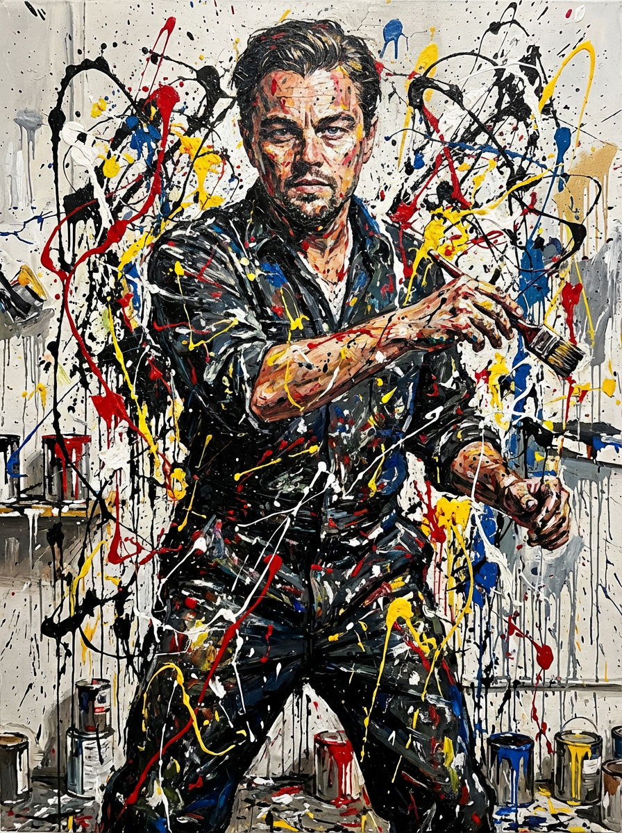 Model as an abstract expressionist portrait. Bold gestures, artistic energy. Pollock-inspired style.