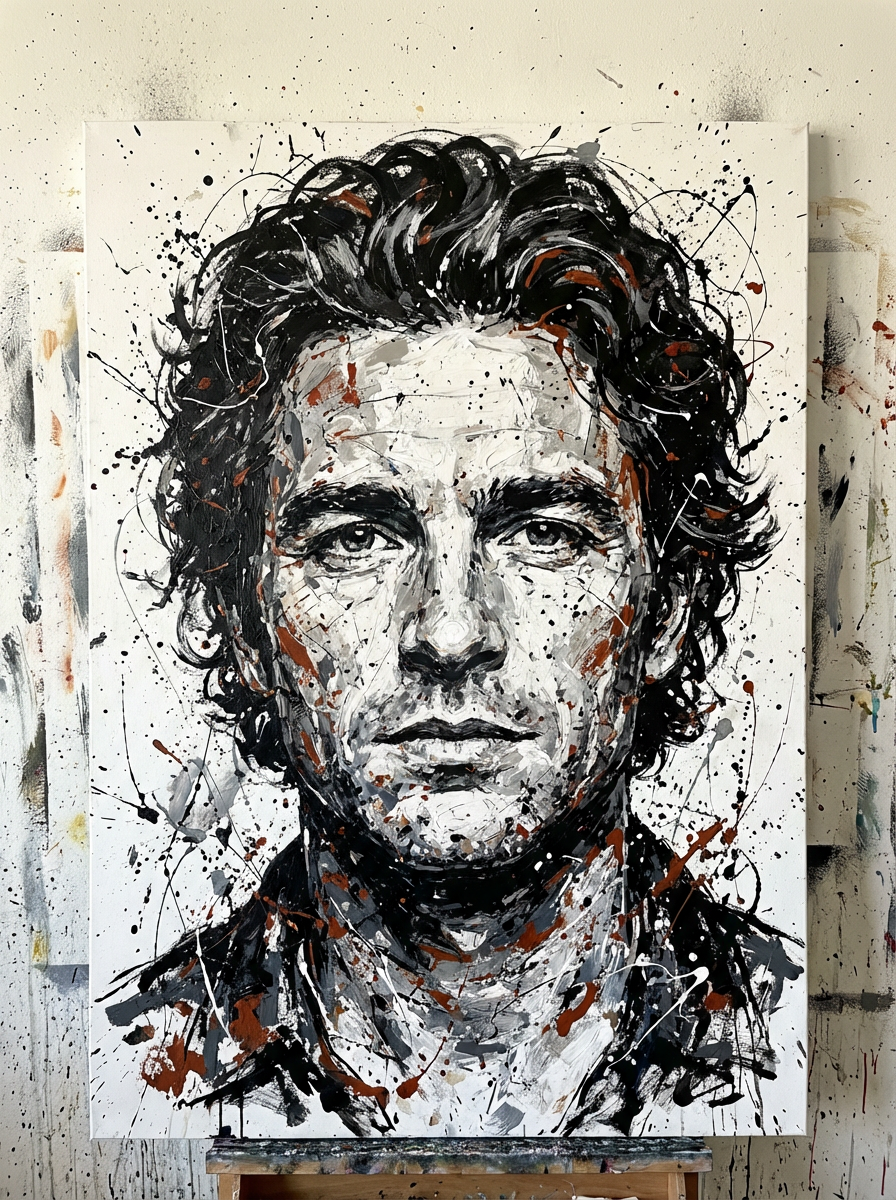 Model as an abstract expressionist portrait. Bold gestures, artistic energy. Pollock-inspired style.