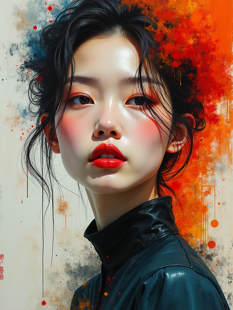 Model as an abstract expressionist portrait. Emotional brushstrokes, dynamic colors . Pollock-inspired style.