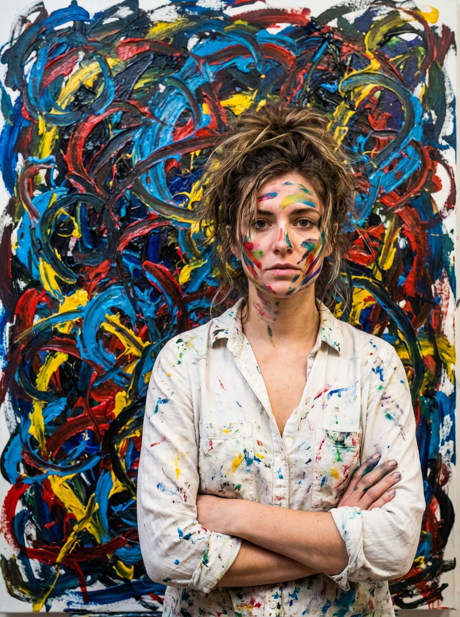 Model as an abstract expressionist portrait. Emotional brushstrokes, dynamic colors . Pollock-inspired style.